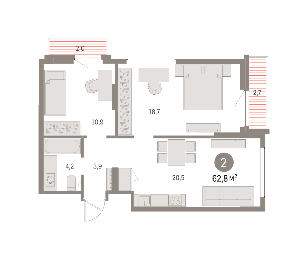 Продаётся с кладовой. Квартира с кухней-гостиной и двумя спальнями в Бруснике в Академическом. Особенности планировки: лоджия, предчистовая отделка, балкон. № квартиры в нашей базе: АКД05-Ж3.9.2.