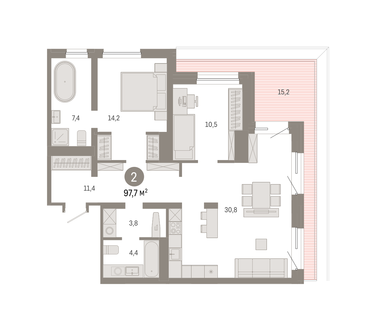 Квартира с кухней-гостиной и двумя спальнями в Северном квартале. Особенности планировки: гардеробная, окно в санузле, вид во двор, предчистовая отделка, мастер-спальня, постирочная, терраса на крыше.