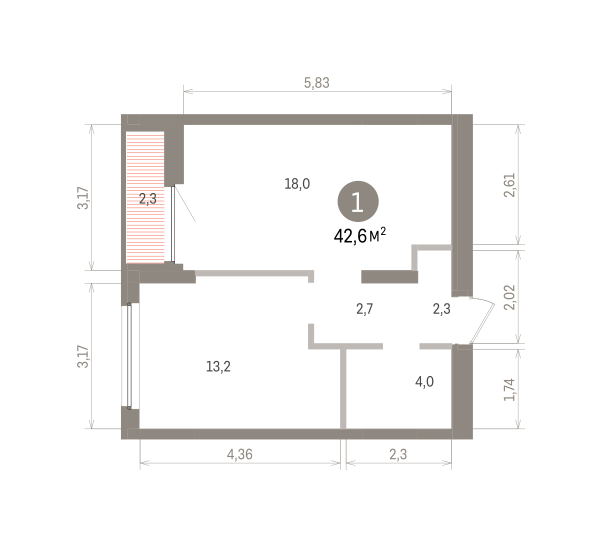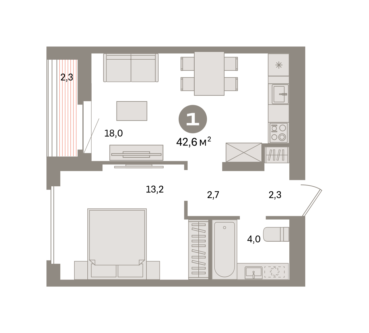 Квартира с кухней-гостиной и одной спальней в квартале «Депо». Особенности планировки: лоджия, предчистовая отделка. № квартиры в нашей базе: ДЕП07-Ж1.15.4.