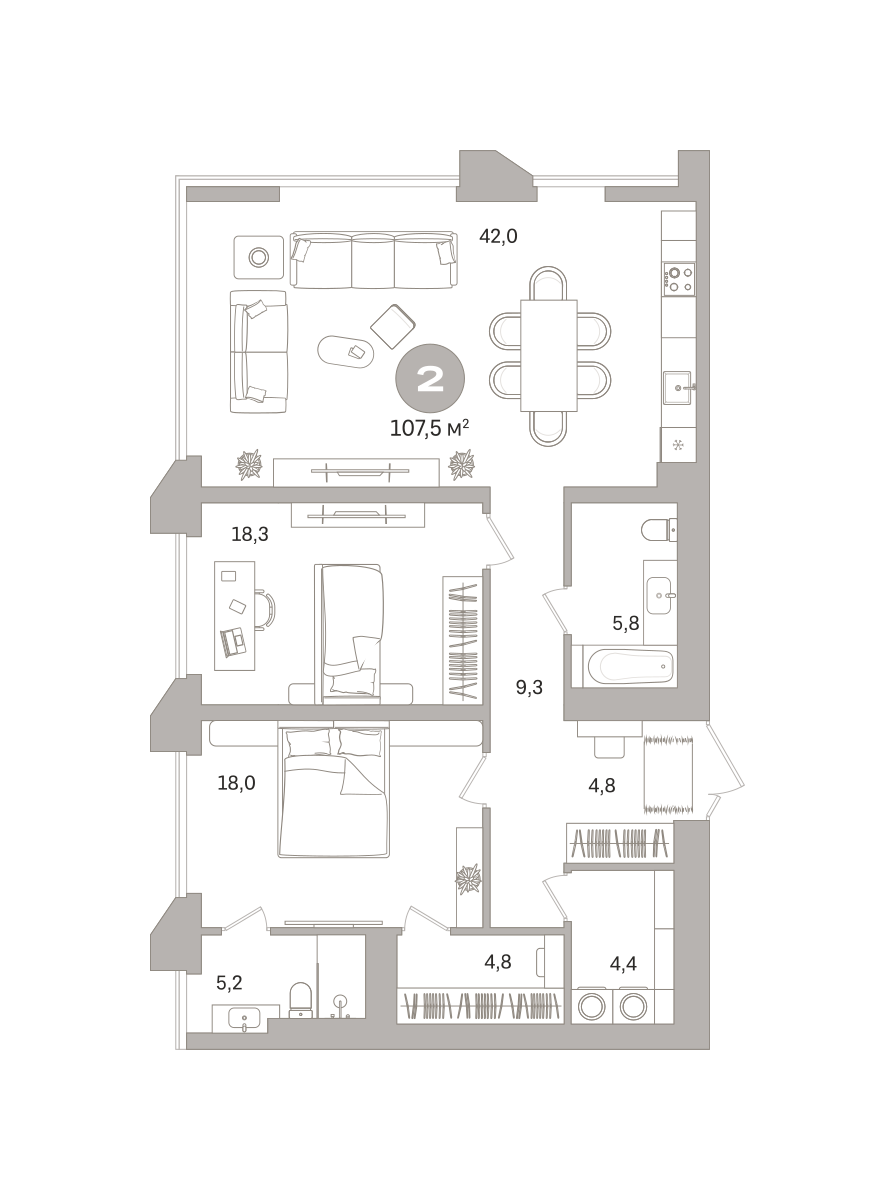 Квартира с кухней-гостиной и двумя спальнями в проекте Гоголя 21. Особенности планировки: без отделки, свободная планировка. № квартиры в нашей базе: ЗНГ01-Ж1.4.2.
