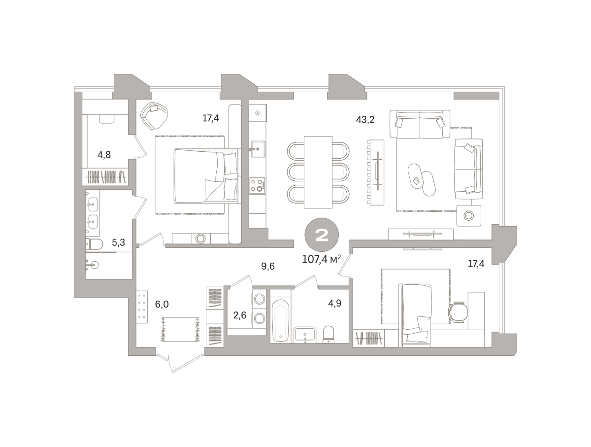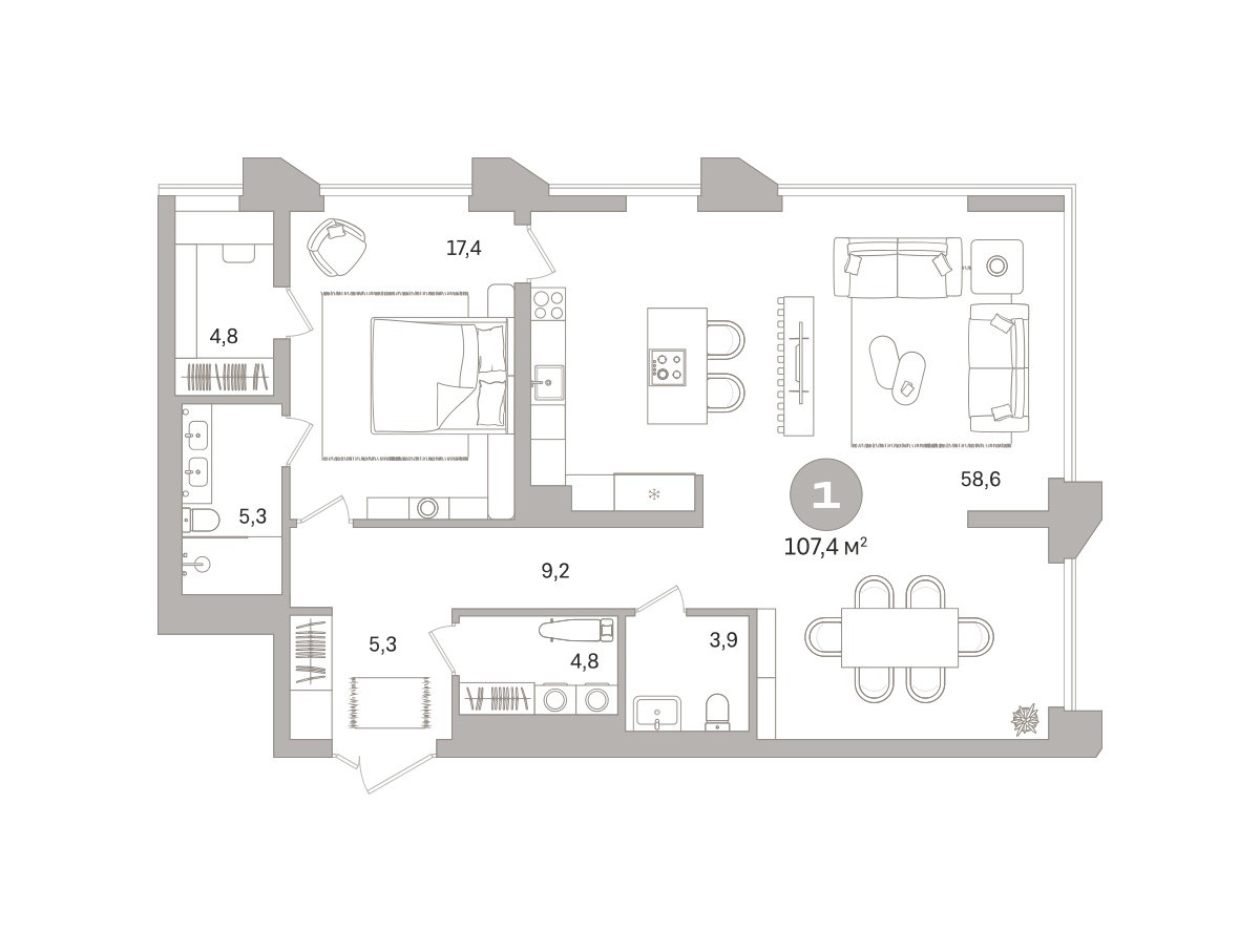 Квартира с кухней-гостиной и двумя спальнями в проекте Гоголя 21. Особенности планировки: без отделки, свободная планировка. № квартиры в нашей базе: ЗНГ01-Ж1.15.5.
