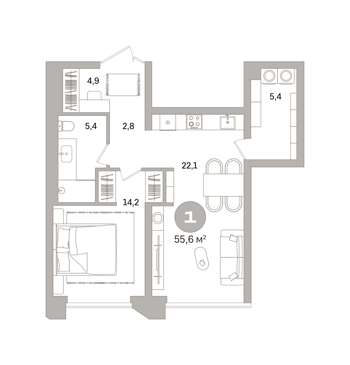 Квартира с кухней-гостиной и одной спальней в проекте Гоголя 21. Особенности планировки: без отделки, свободная планировка. № квартиры в нашей базе: ЗНГ01-Ж1.12.2.