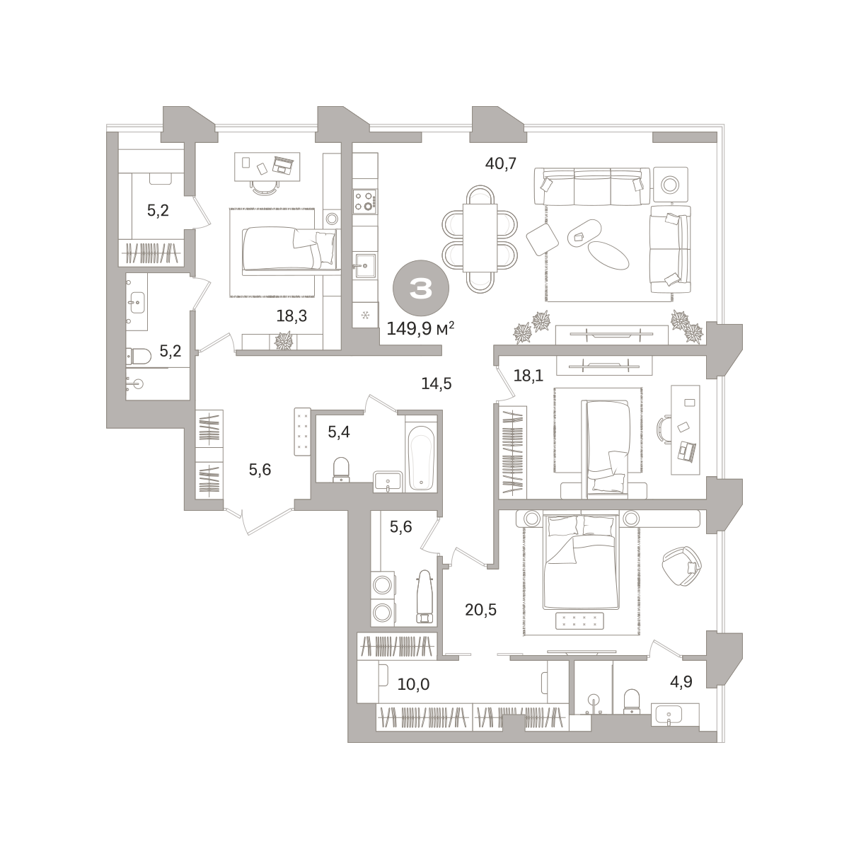 Квартира с кухней-гостиной и тремя спальнями в проекте Гоголя 21. Особенности планировки: без отделки, свободная планировка. № квартиры в нашей базе: ЗНГ01-Ж1.18.4.