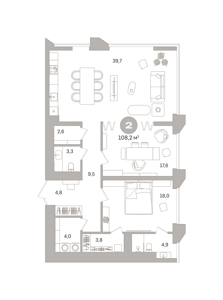 Квартира с кухней-гостиной и двумя спальнями в проекте Гоголя 21. Особенности планировки: без отделки, свободная планировка. № квартиры в нашей базе: ЗНГ01-Ж1.6.6.