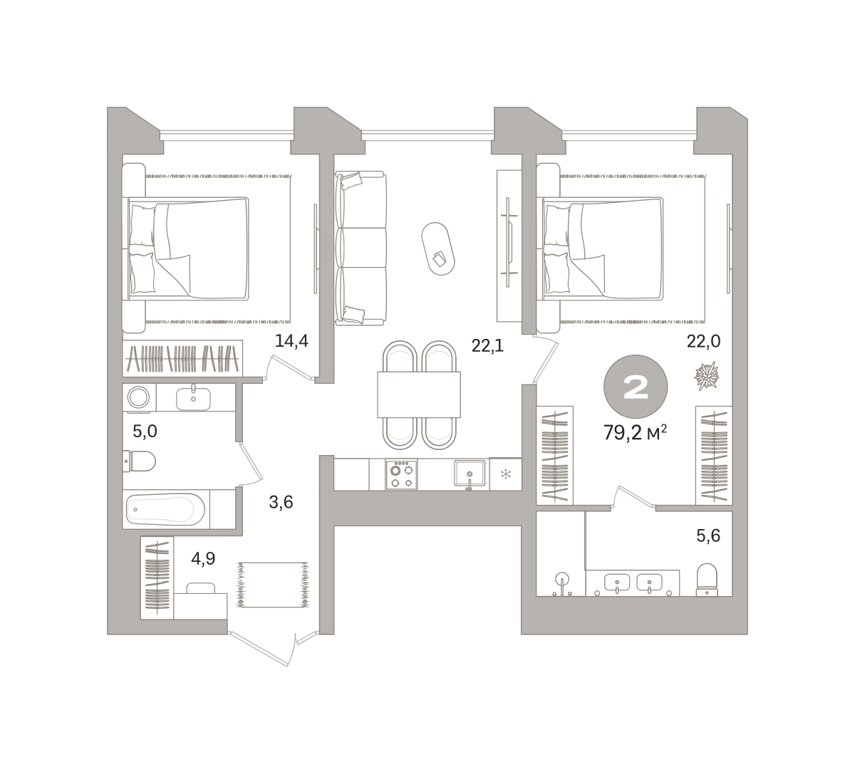 Квартира с кухней-гостиной и двумя спальнями в проекте Гоголя 21. Особенности планировки: без отделки, свободная планировка. № квартиры в нашей базе: ЗНГ01-Ж1.8.5.
