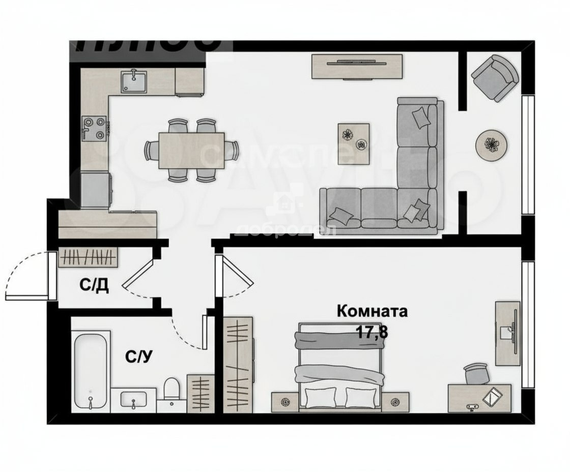 ✅ Современная планировка с зоной кухни-гостиной и отдельной комнатой, идеально подходящей для семейного комфорта.