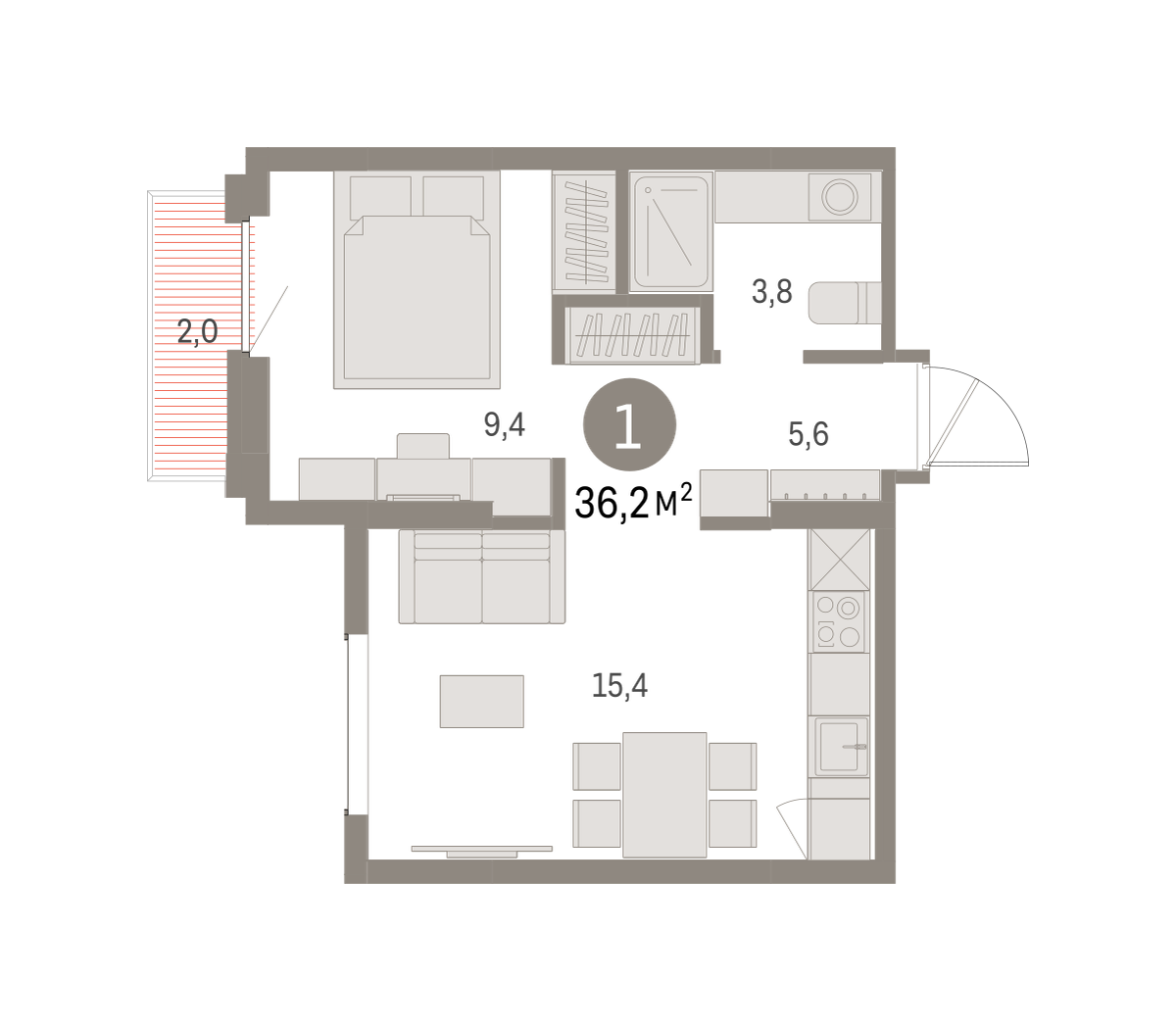 Квартира с кухней-гостиной и одной спальней в Бруснике в Академическом. Особенности планировки: предчистовая отделка, балкон. № квартиры в нашей базе: АКД05-Ж8.4.3.