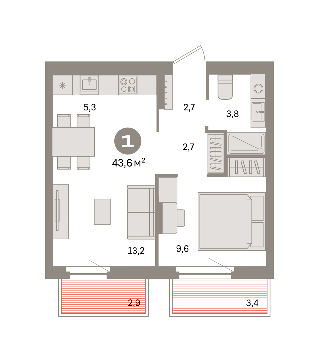 43.00 м² | 5 - 9 эт.