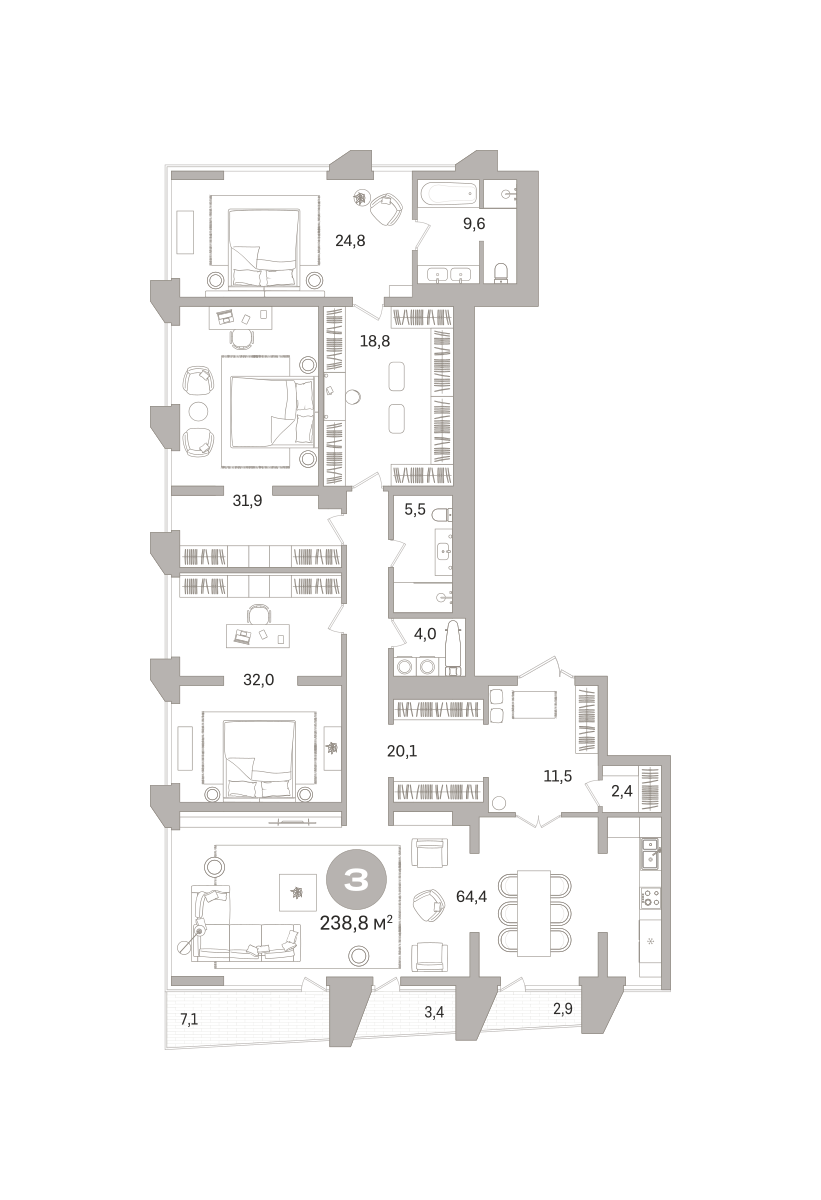 Квартира с кухней-гостиной и тремя спальнями в проекте Гоголя 21. Особенности планировки: без отделки, свободная планировка, лоджия. № квартиры в нашей базе: ЗНГ01-Ж2.18.3.