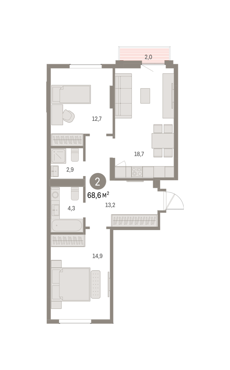 Квартира с кухней-гостиной и двумя спальнями в Бруснике в Академическом. Особенности планировки: окна на две стороны, второй санузел, вид во двор, разнесённые спальни, предчистовая отделка, балкон.