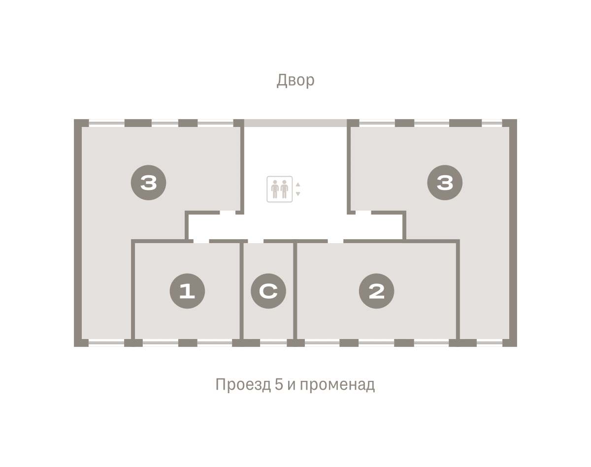 Квартира с кухней-гостиной и тремя спальнями в Бруснике в Академическом. Особенности планировки: второй санузел, гардеробная, вид во двор, разнесённые спальни, предчистовая отделка, мастер-спальня, постирочная, балкон.