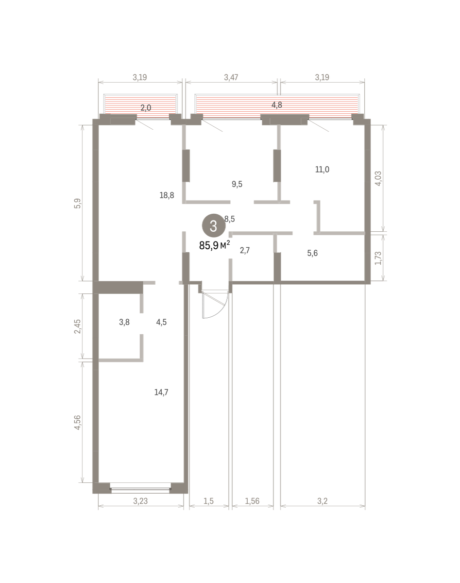 Квартира с кухней-гостиной и тремя спальнями в Бруснике в Академическом. Особенности планировки: окна на две стороны, гардеробная, вид во двор, разнесённые спальни, предчистовая отделка, мастер-спальня, балкон.