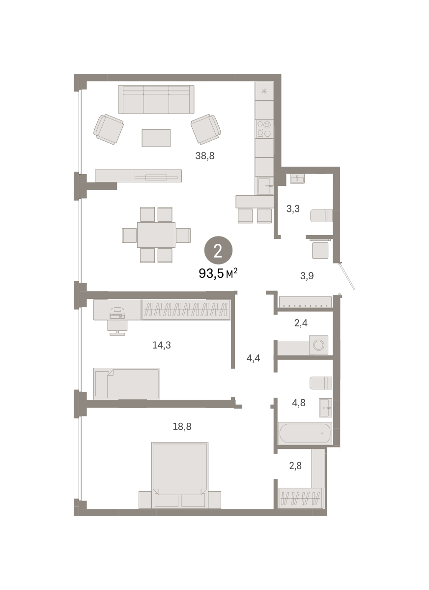 Квартира с кухней-гостиной и двумя спальнями в районе Шишимская горка. Особенности планировки: второй санузел, окна в пол, без отделки, постирочная.