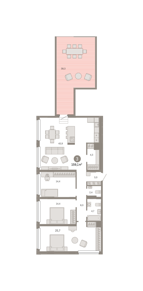 Трёхкомнатная квартира в микрорайоне «Шишимская горка» от застройщика «Брусника» — это квартира с объединенной кухней-гостиной и тремя спальнями. В квартире предусмотрена просторная ванная комната, гостевой санузел, ниши под хранение и гардеробные. Комнаты в трёхкомнатной квартире имеют правильную прямоугольную форму близкую к квадрату. Отсутствуют лишние углы и выступы. Гардеробные зоны и ниши для шкафов помогают разумно использовать пространство 3к квартиры, иметь больше свободного места.