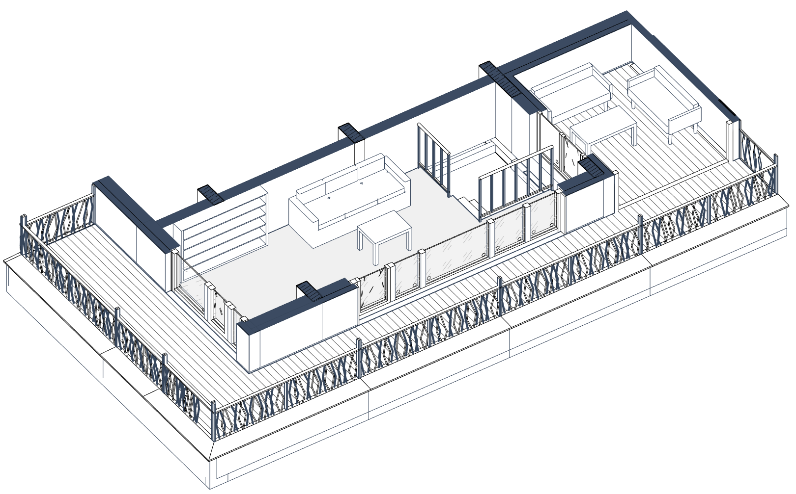 Двор закрыт от машин и оформлен в стиле скандинавского натурализма. Он похож на парк, сформировавшийся без участия человека и сохраняющий обаяние в течение всего года. Под домом запроектирован подземный паркинг, а также кладовые для хранения сезонных вещей.