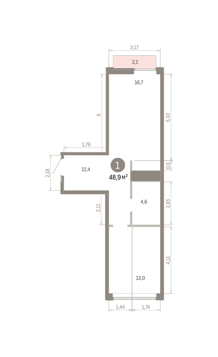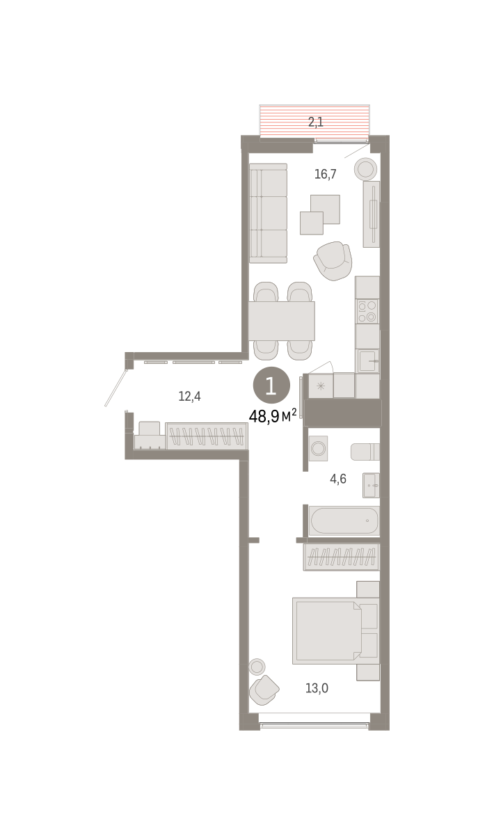 Квартира с кухней-гостиной и одной спальней в районе Шишимская горка. Особенности планировки: окна на две стороны, предчистовая отделка, балкон. № квартиры в нашей базе: ШГР16-Ж3.6.1.