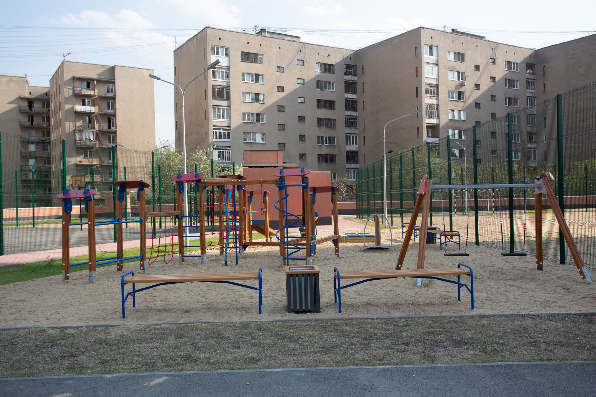 Во дворе установлены качели, карусели и детский игровой комплекс. Для детей младшего возраста предусмотрены две площадки с песочницей и безопасными качелями. Для занятий спортом есть уличные тренажеры, столы для армрестлинга и игры в теннис, баскетбольная площадка, поле для мини-футбола и велодорожка.