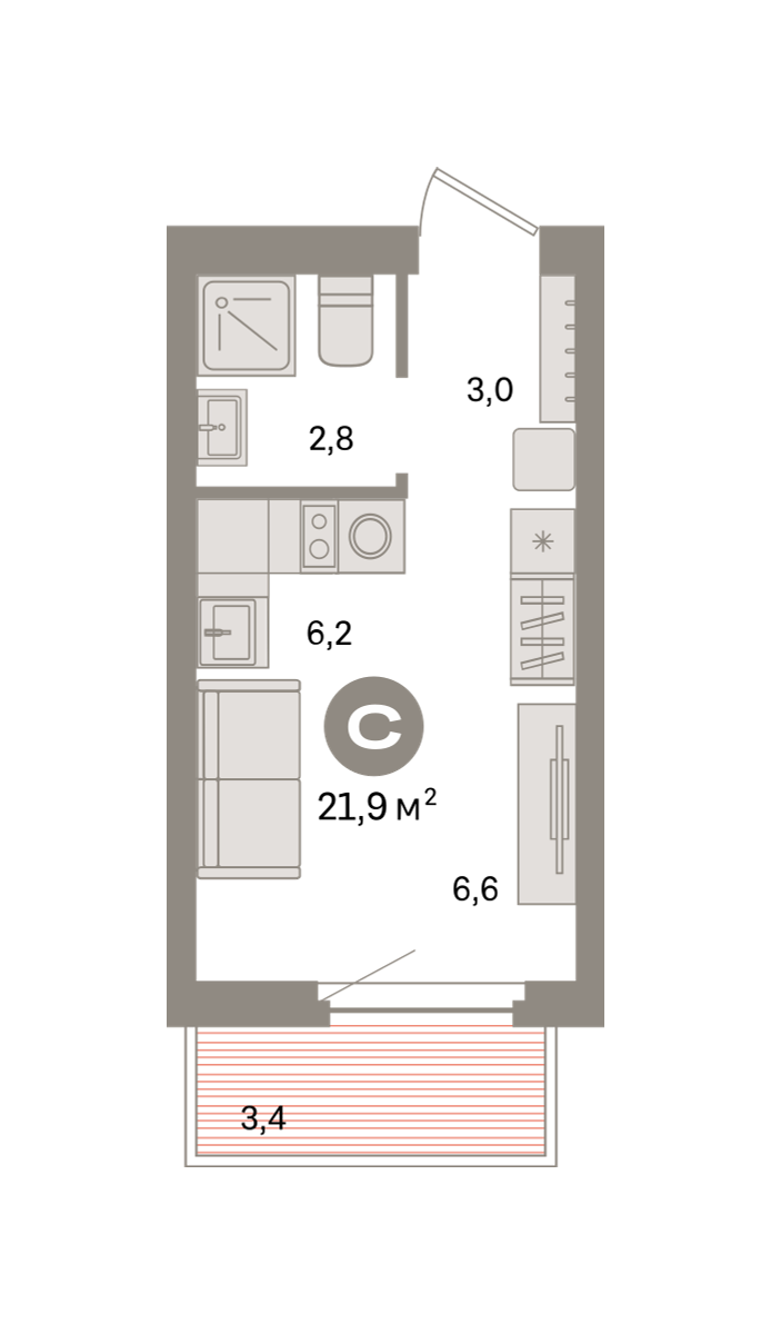 Студия в квартале «Депо». Особенности планировки: предчистовая отделка, балкон. № квартиры в нашей базе: ДЕП07-Ж5.4.3.