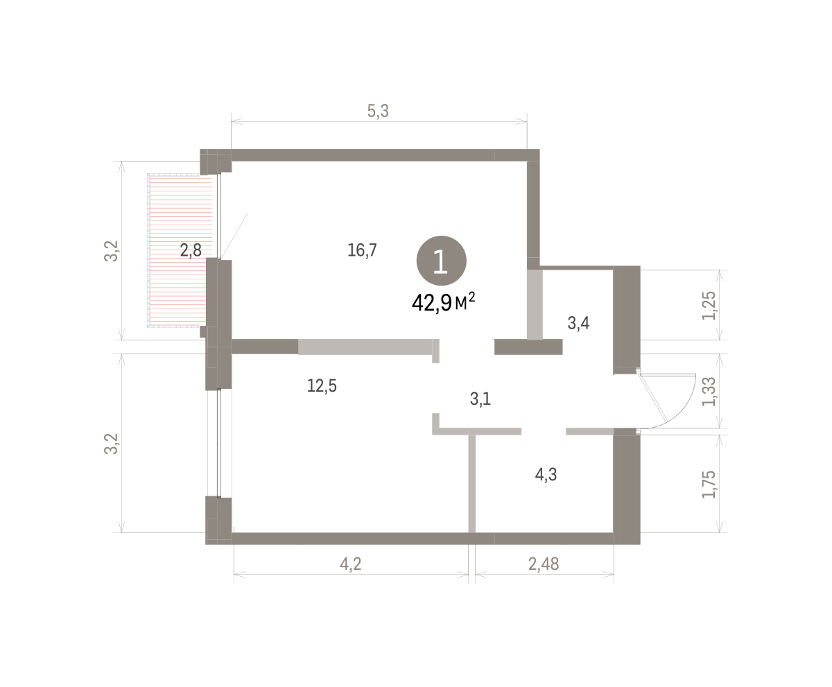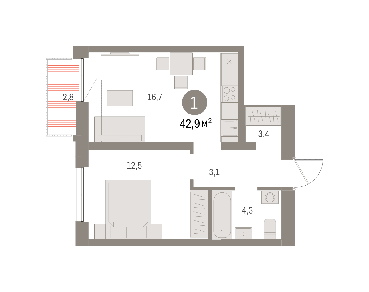 1-к квартира | 42.36 м² | 15 - 21 эт.