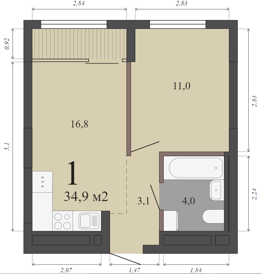 34.90 м² | 9 - 15 эт.