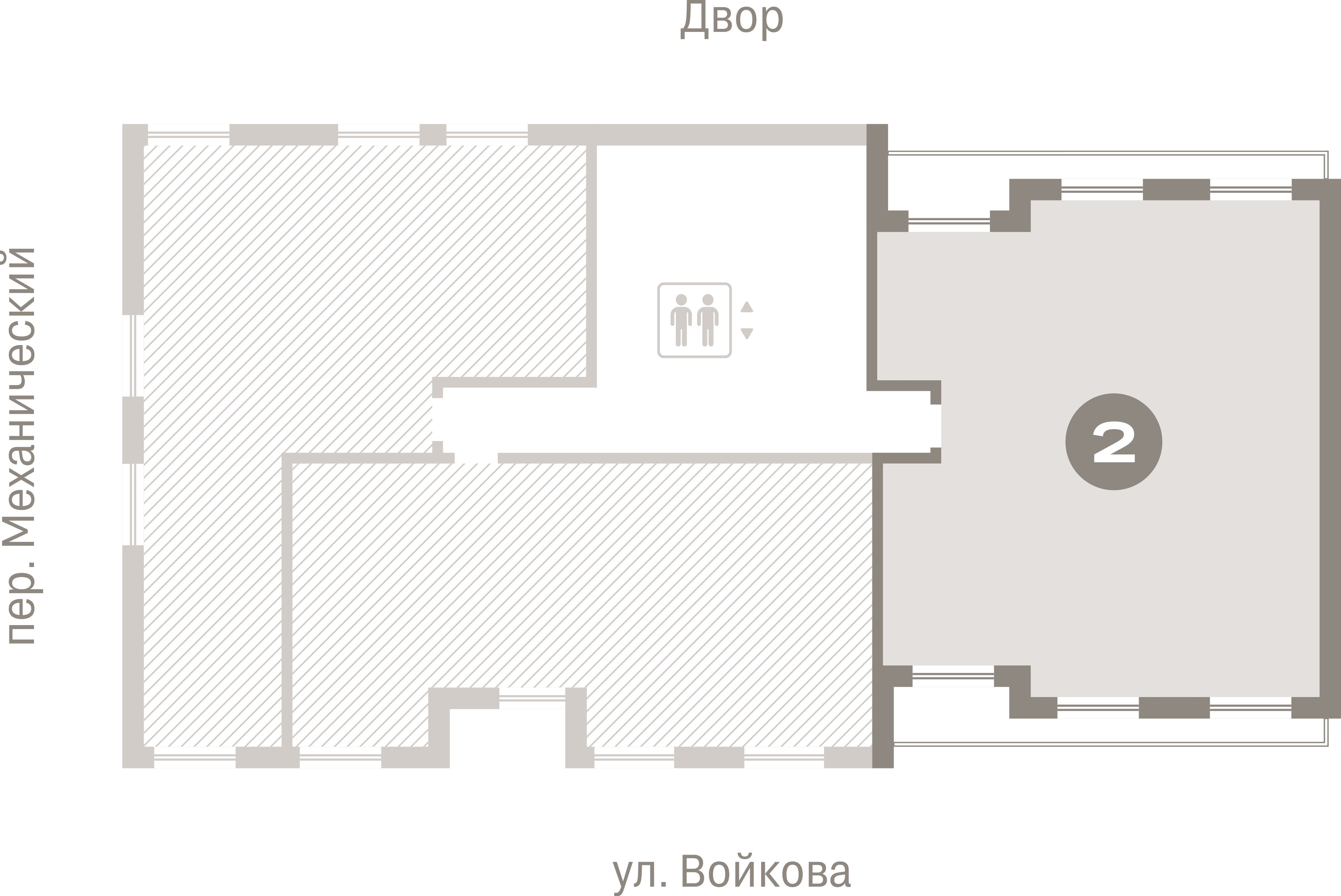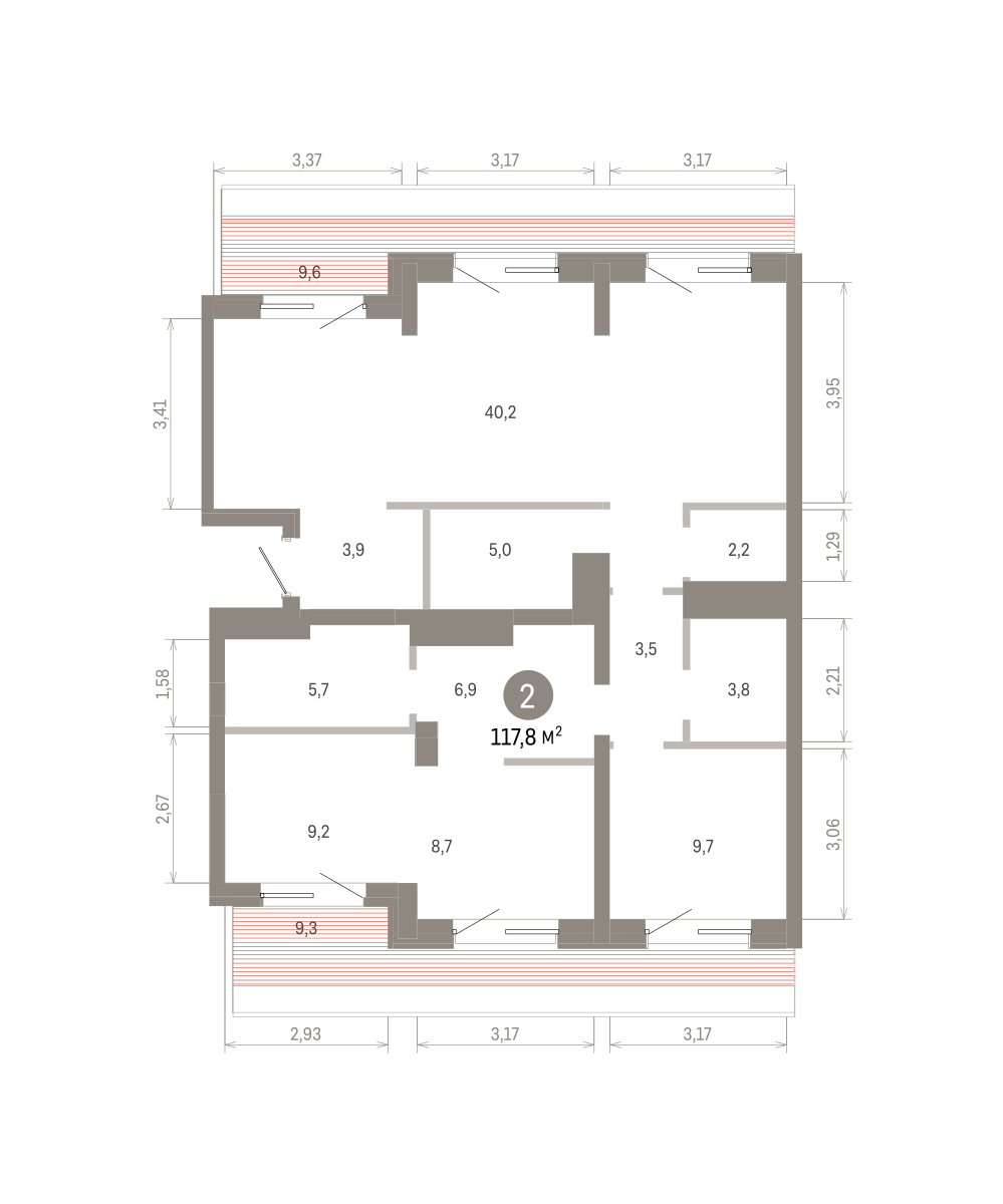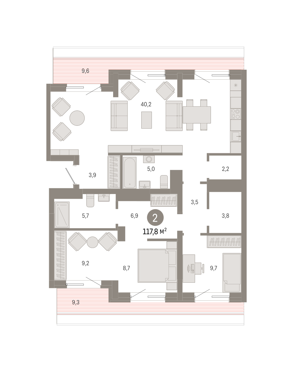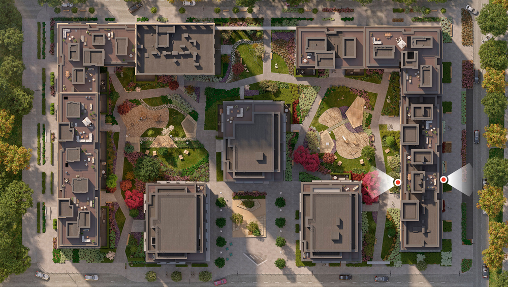 Квартира с кухней-гостиной и двумя спальнями в Северном квартале. Особенности планировки: окна на две стороны, гардеробная, вид во двор, предчистовая отделка, мастер-спальня, терраса на крыше.