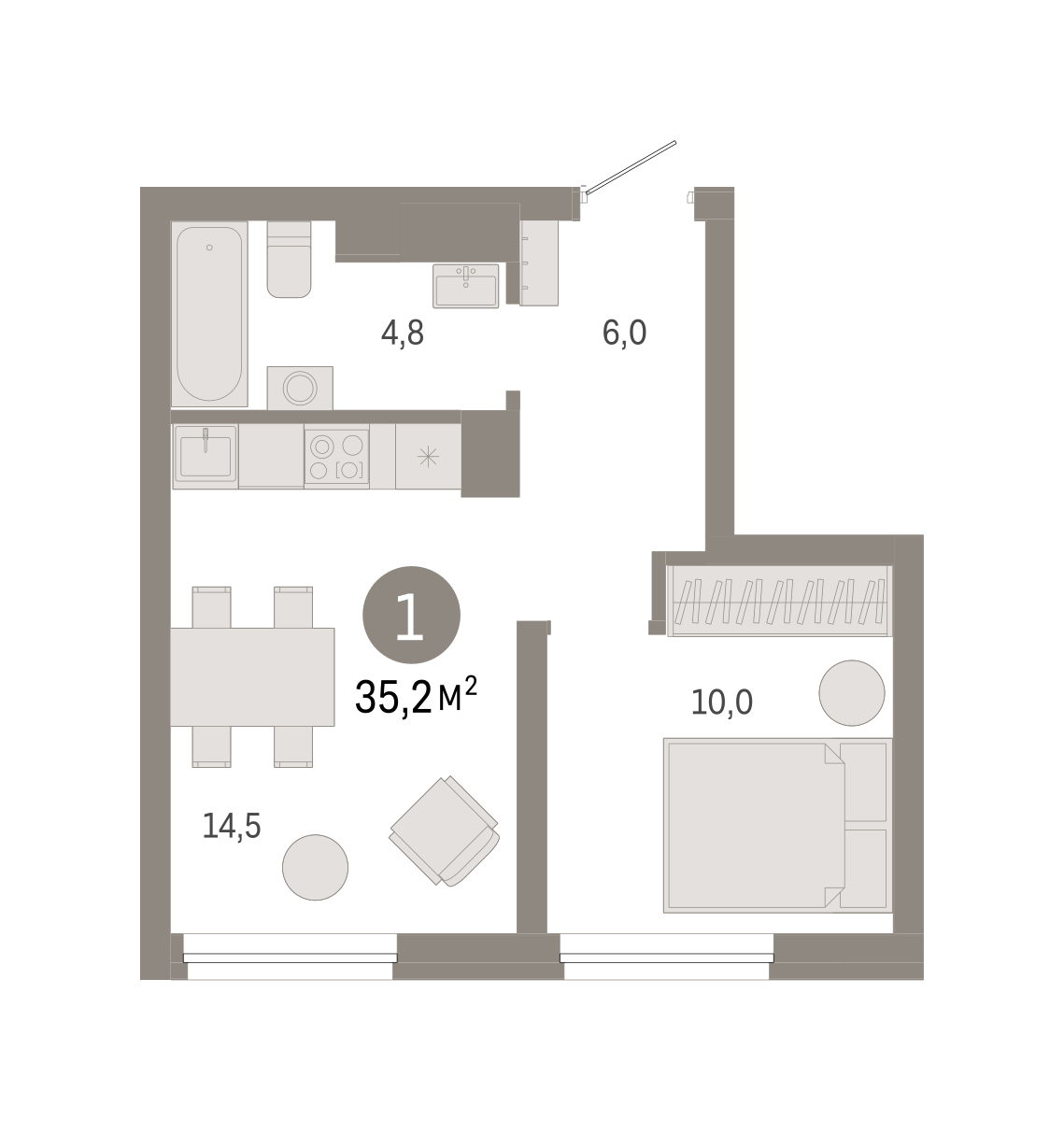 Квартира с кухней-гостиной и одной спальней в Северном квартале. Особенности планировки: предчистовая отделка. № квартиры в нашей базе: СКВ03.2-Ж1.5.5.
