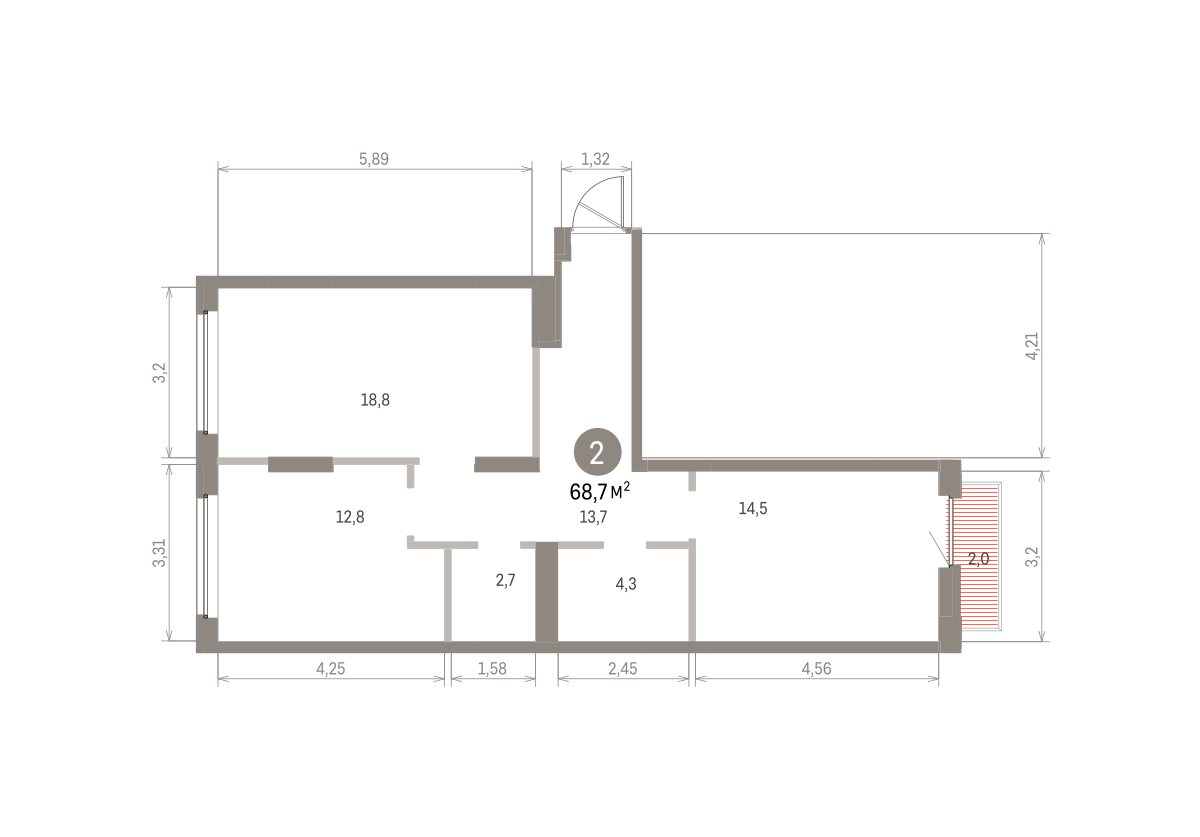 Квартира с кухней-гостиной и двумя спальнями в Бруснике в Академическом. Особенности планировки: окна на две стороны, второй санузел, вид во двор, разнесённые спальни, предчистовая отделка, балкон.