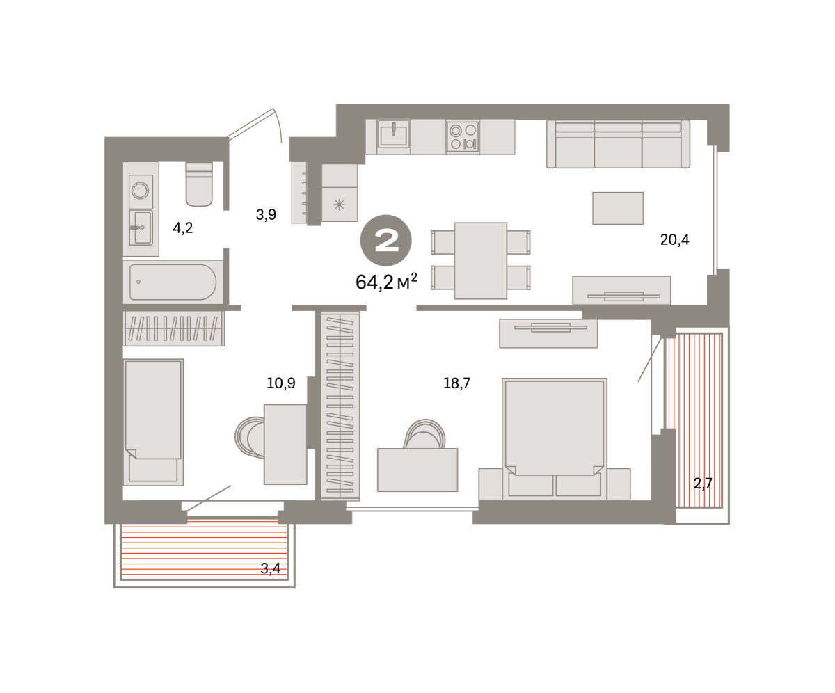 Продаётся с кладовой. Квартира с кухней-гостиной и двумя спальнями в квартале «Депо». Особенности планировки: разнесённые спальни, предчистовая отделка, балкон. № квартиры в нашей базе: ДЕП04-Ж5.4.5.