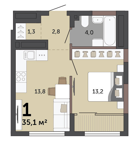 1-к квартира | 35.54 м² | 12 - 17 эт.