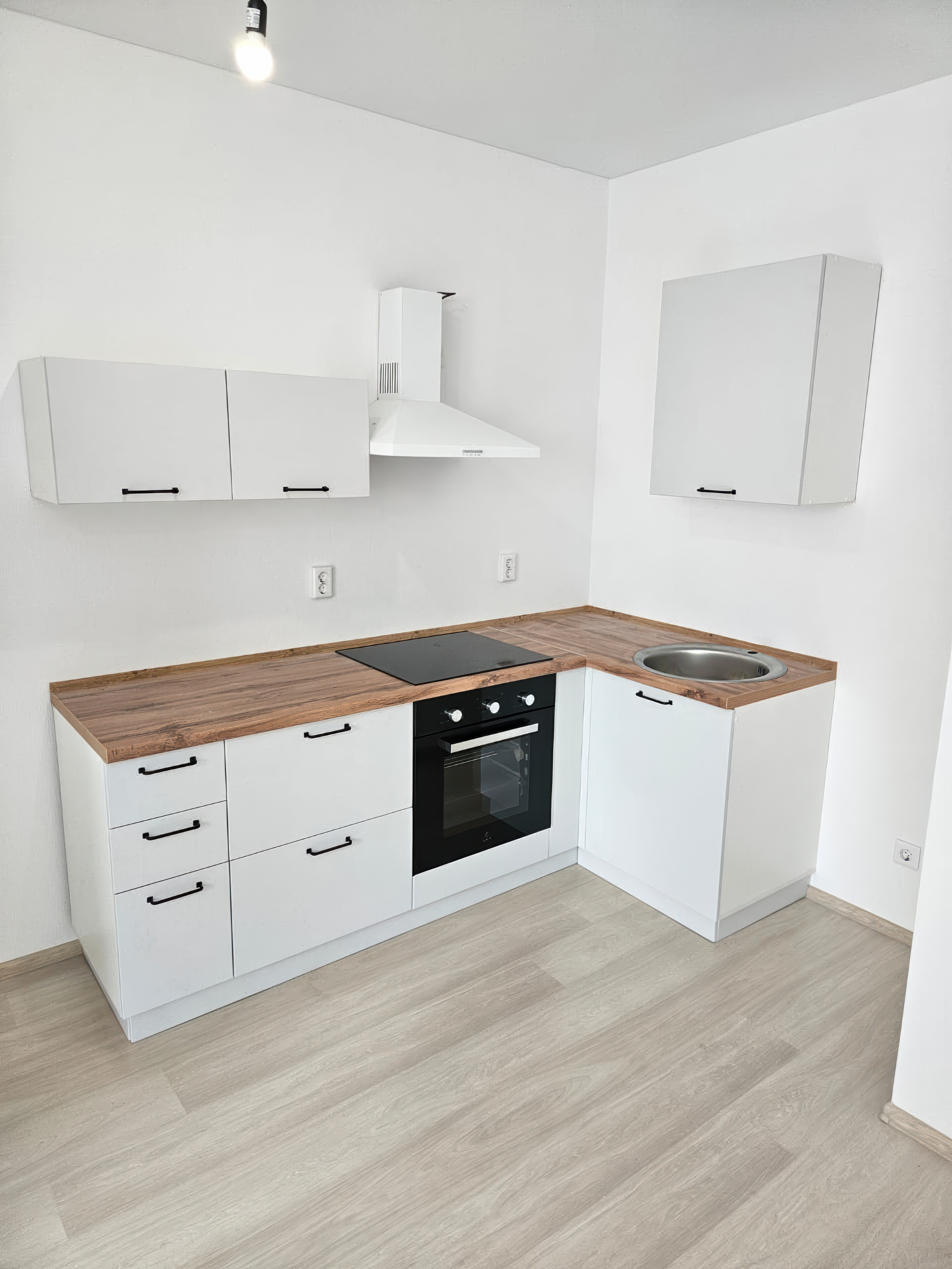 • Установлен кухонный гарнитур с техникой: МДФ фасады, столешница, ящики с доводчиками, вытяжка, варочная панель, электрический духовой шкаф, мойка