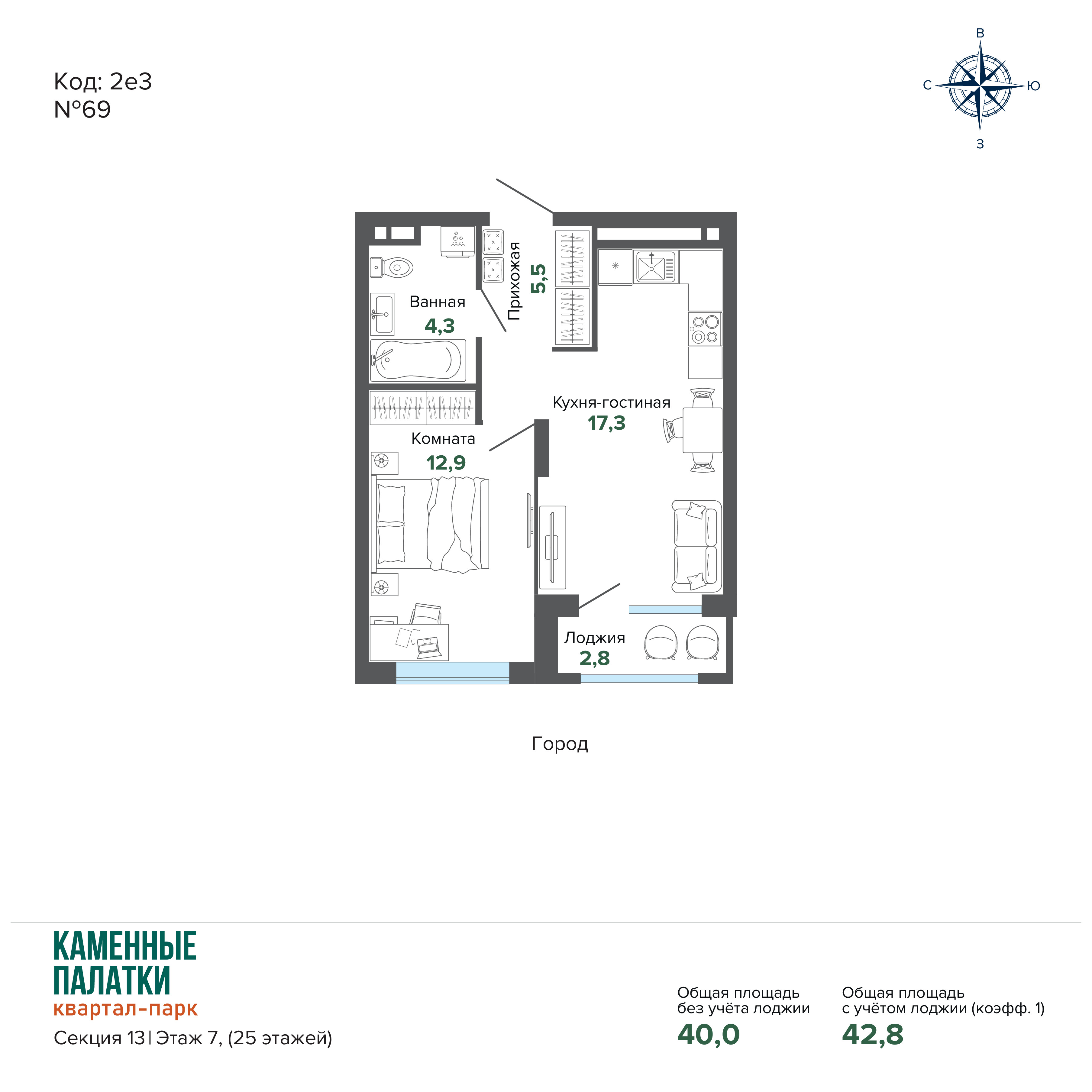 1-к квартира | 42.20 м² | 16 - 16 эт.