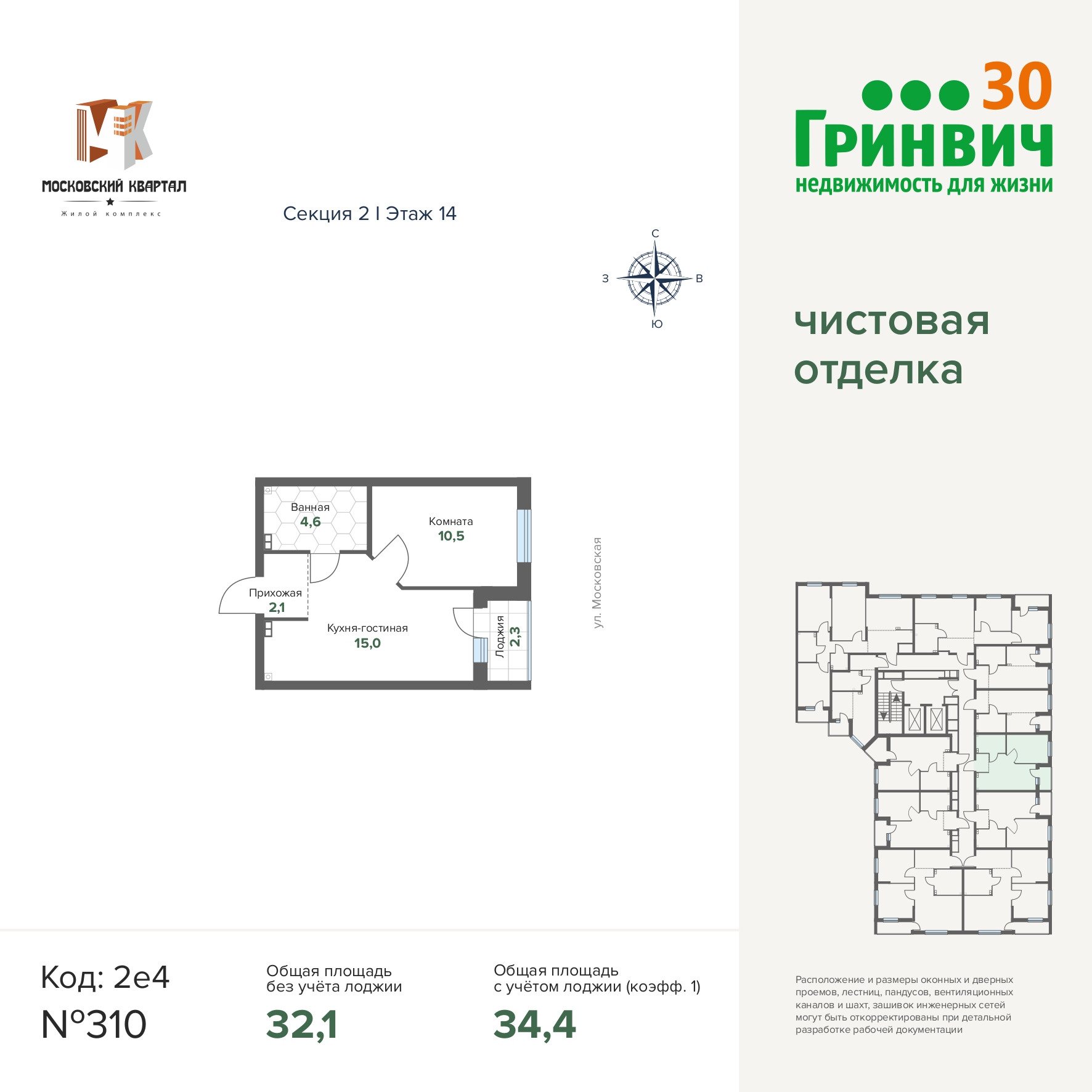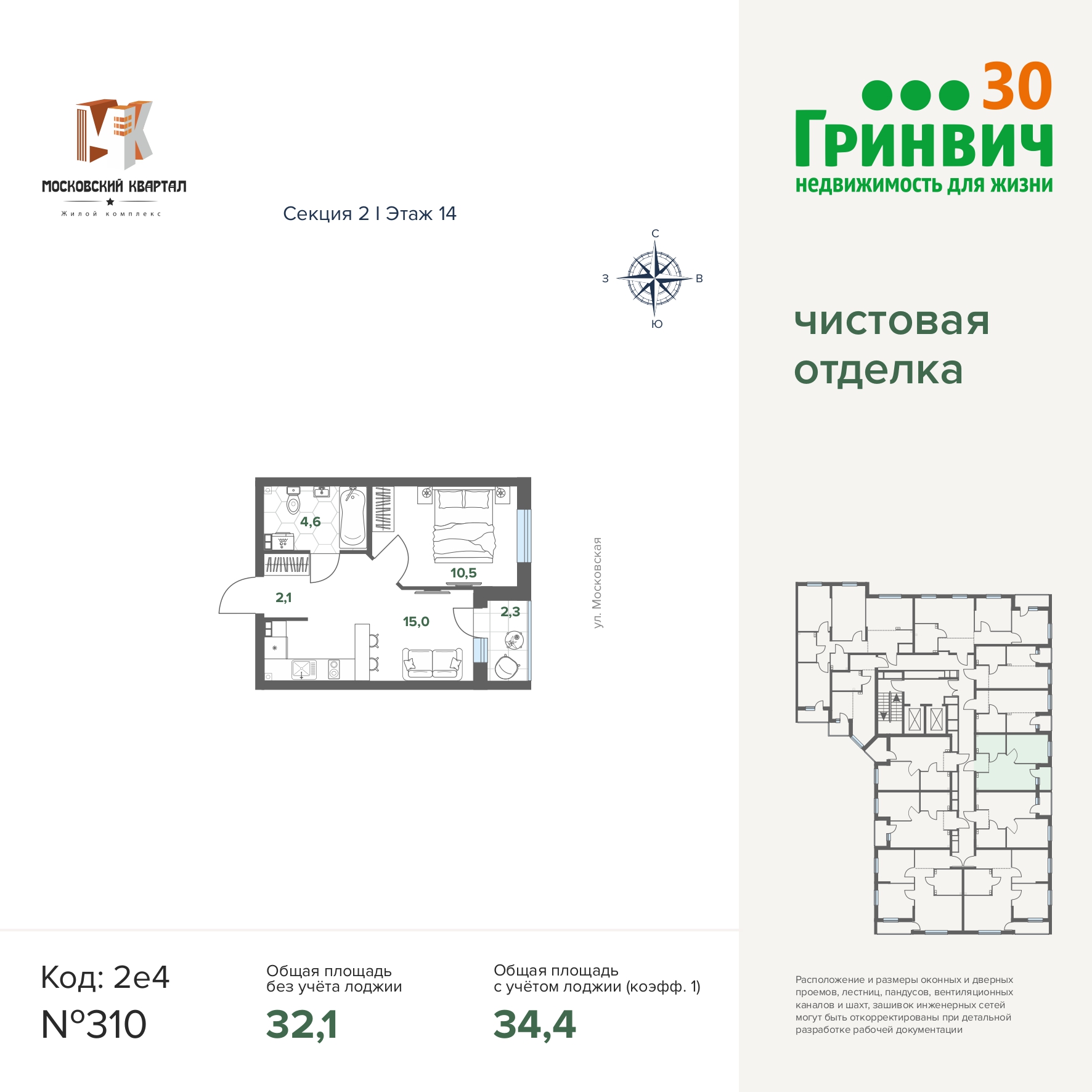 34.40 м² | 14 - 17 эт.