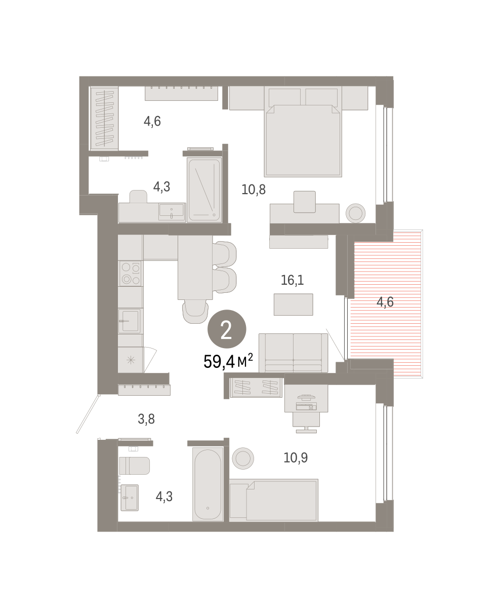 Квартира с кухней-гостиной и двумя спальнями в Бруснике в Академическом. Особенности планировки: второй санузел, гардеробная, разнесённые спальни, предчистовая отделка, мастер-спальня, балкон.
