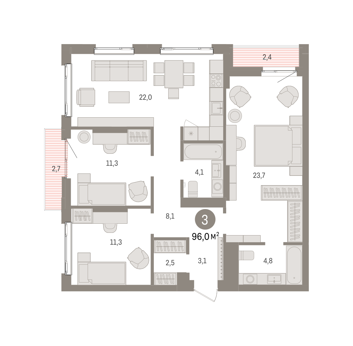 3-к квартира | 90.00 м² | 3 - 21 эт.