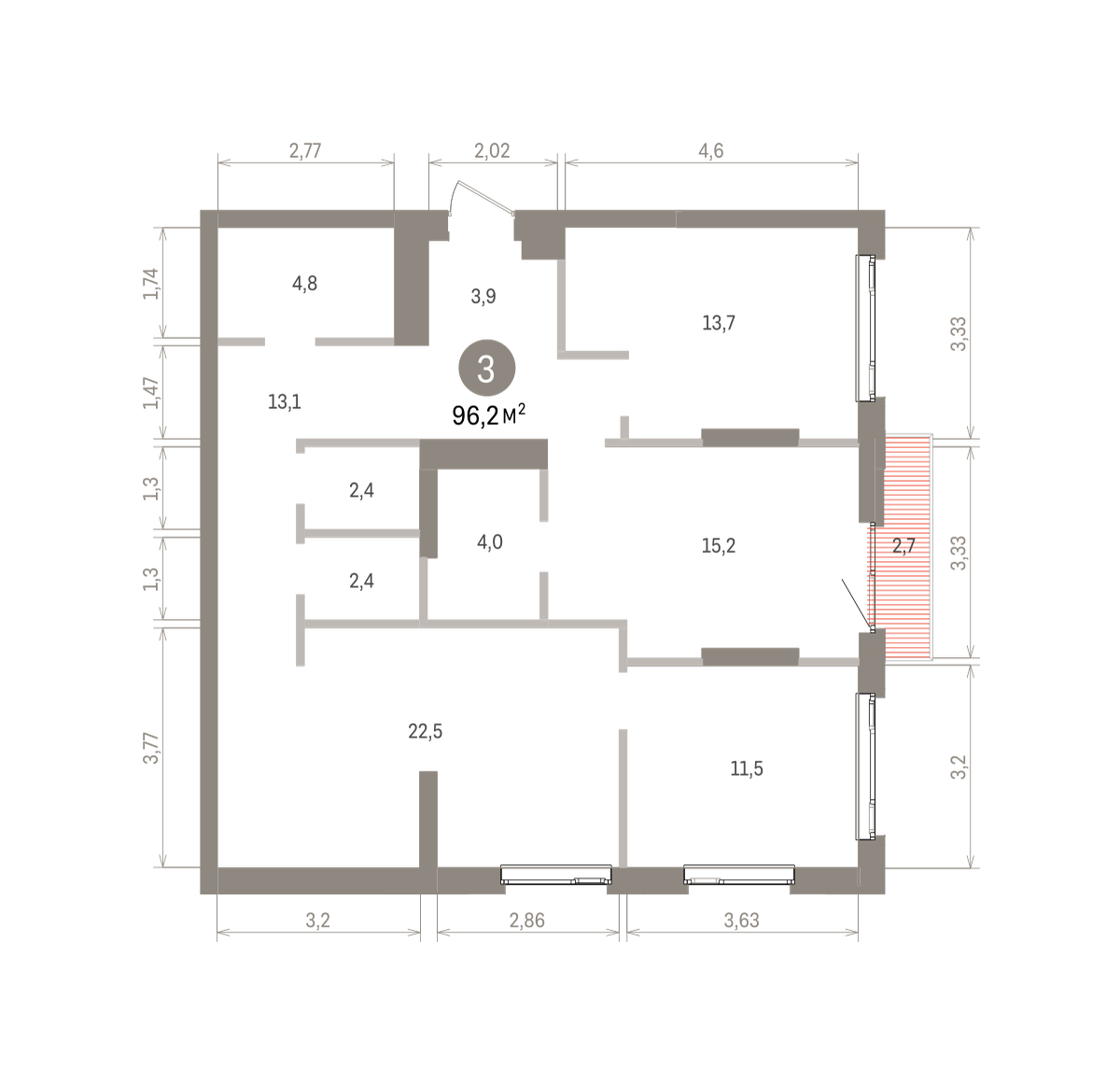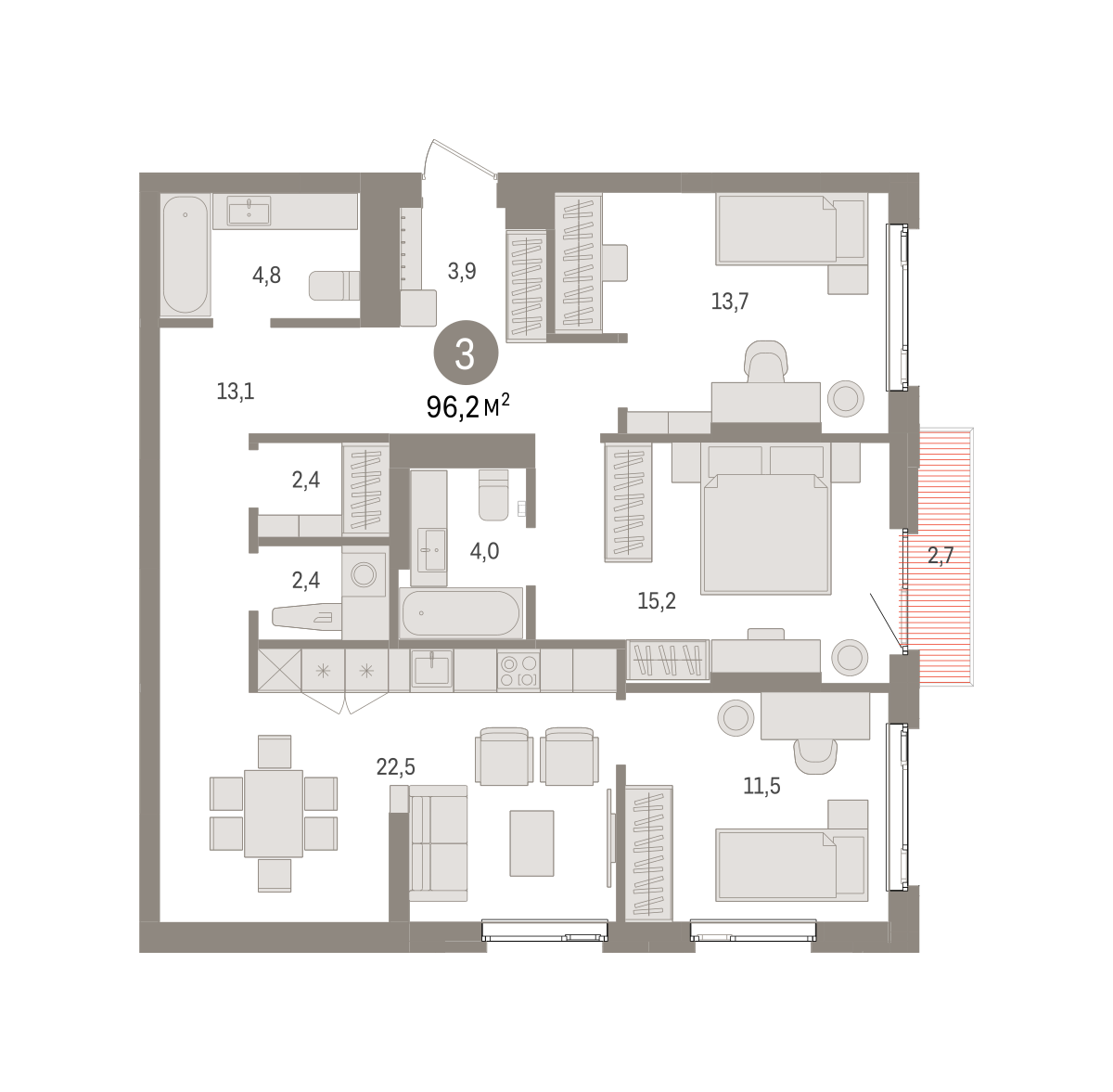 Квартира с кухней-гостиной и тремя спальнями в квартале «Траектория». Особенности планировки: балкон, предчистовая отделка, разнесённые спальни, стартовая цена. № квартиры в нашей базе: МНВ01-Ж1.4.2.
