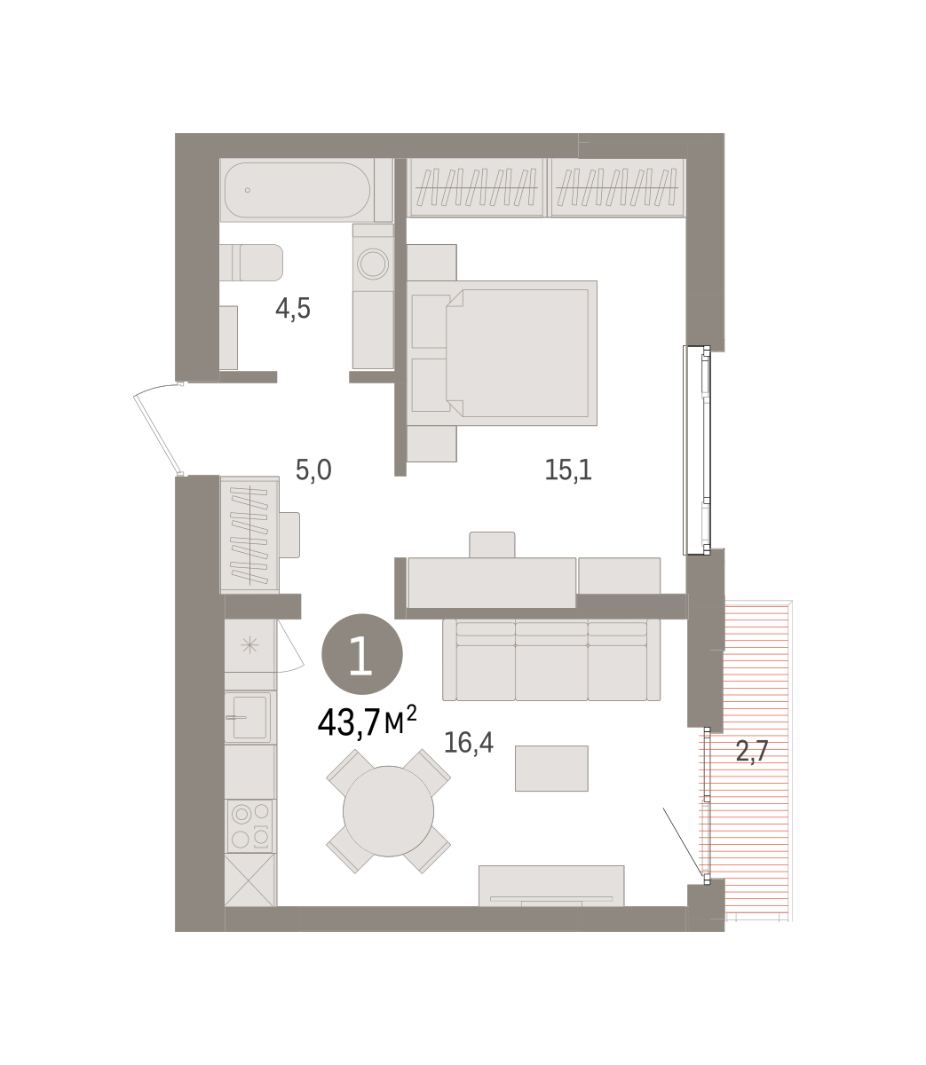 Квартира с кухней-гостиной и одной спальней в квартале «Траектория». Особенности планировки: балкон, предчистовая отделка. № квартиры в нашей базе: МНВ01-Ж7.5.1.