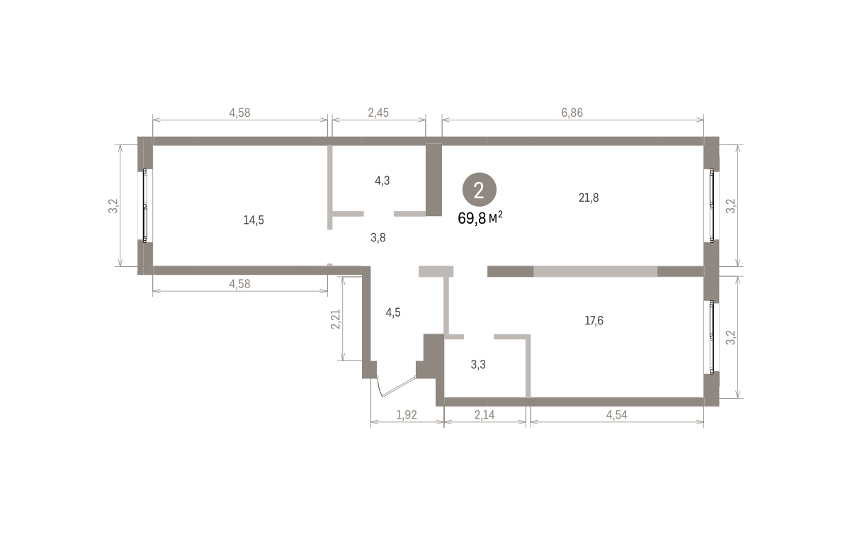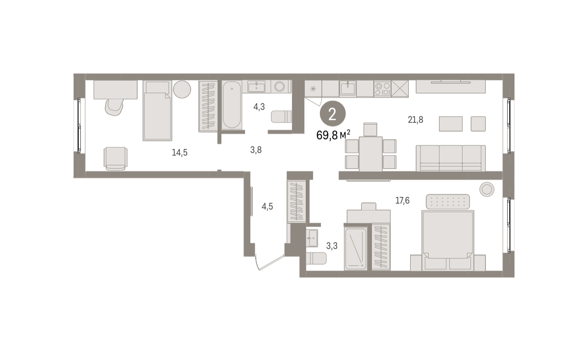 Продаётся с кладовой. Квартира с кухней-гостиной и двумя спальнями в Южных кварталах. Особенности планировки: окна на две стороны, предчистовая отделка, разнесённые спальни. № квартиры в нашей базе: ЮКВ08-Ж4.3.2.