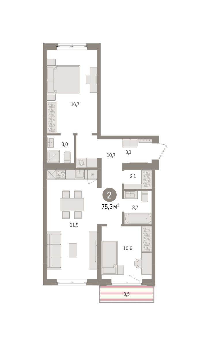 Квартира с кухней-гостиной и двумя спальнями в Южных кварталах. Особенности планировки: балкон, окна на две стороны, предчистовая отделка, разнесённые спальни. № квартиры в нашей базе: ЮКВ08-Ж5.3.5.