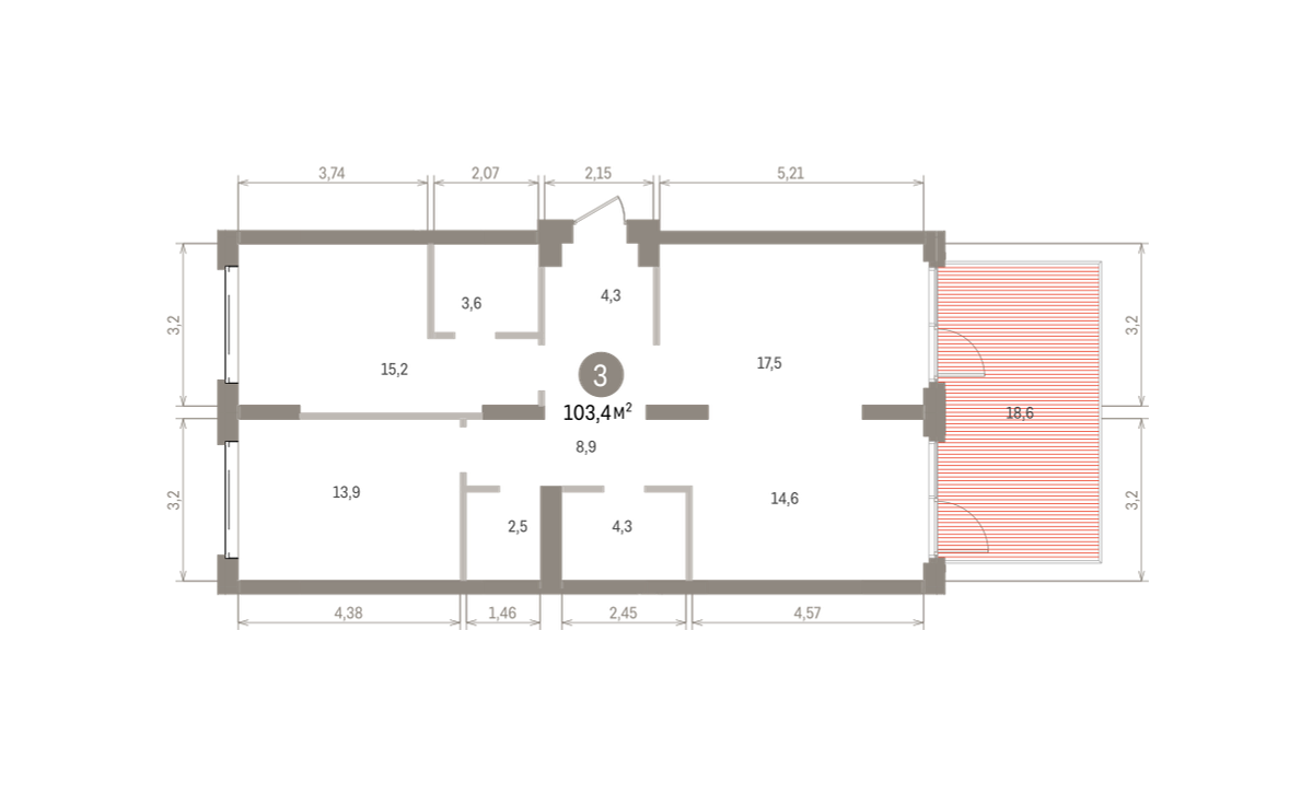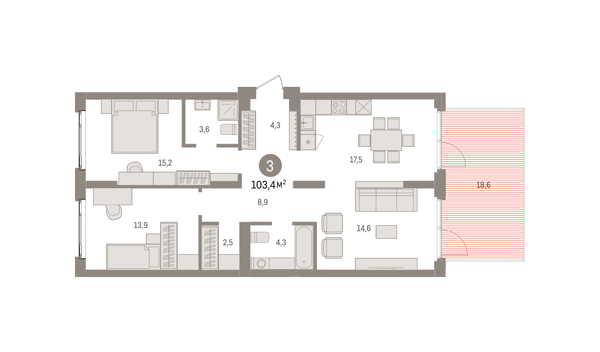 Квартира с кухней-гостиной и тремя спальнями в квартале «Траектория». Особенности планировки: окна на две стороны, предчистовая отделка, разнесённые спальни. № квартиры в нашей базе: МНВ01-Ж7.2.1.