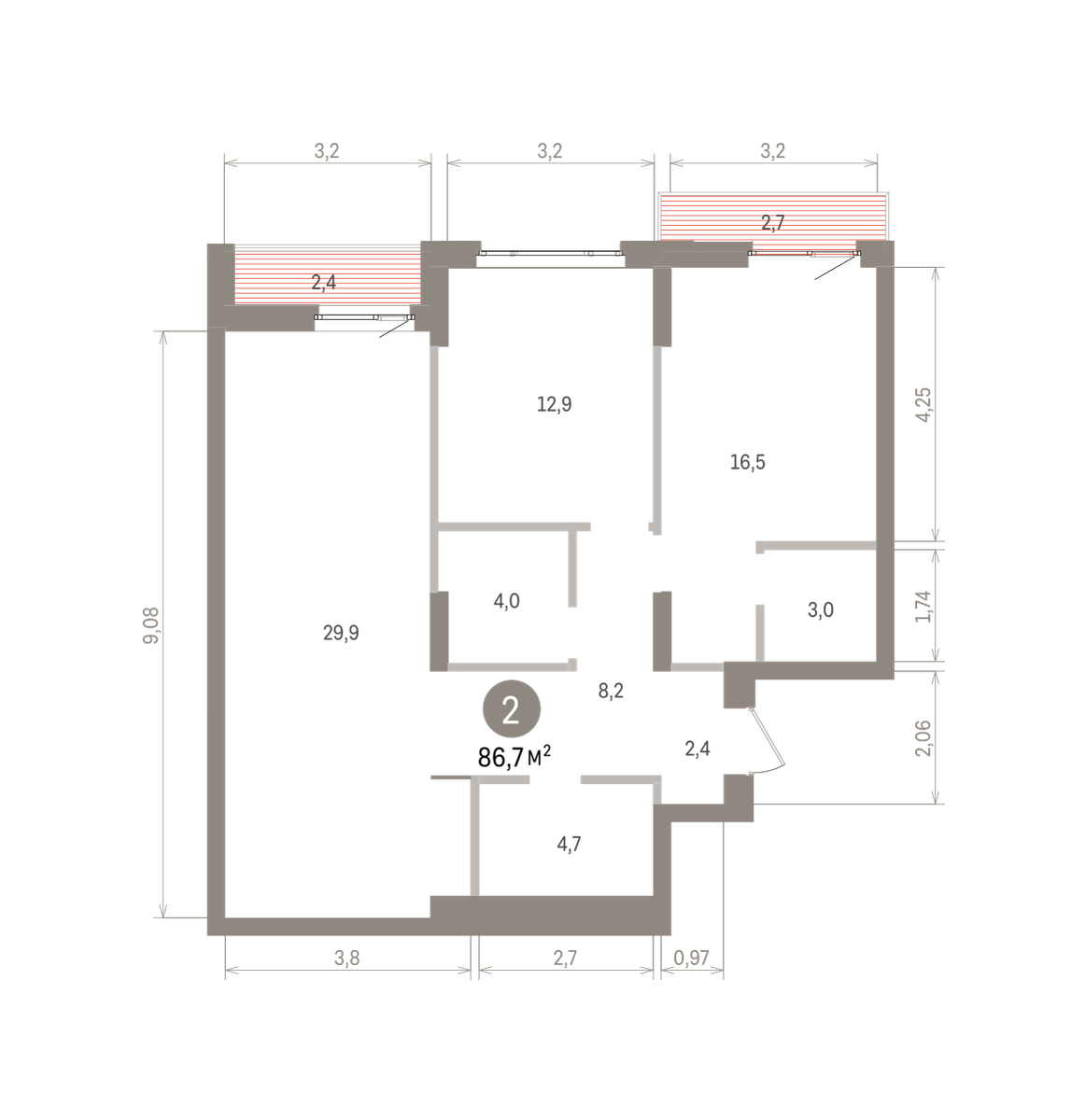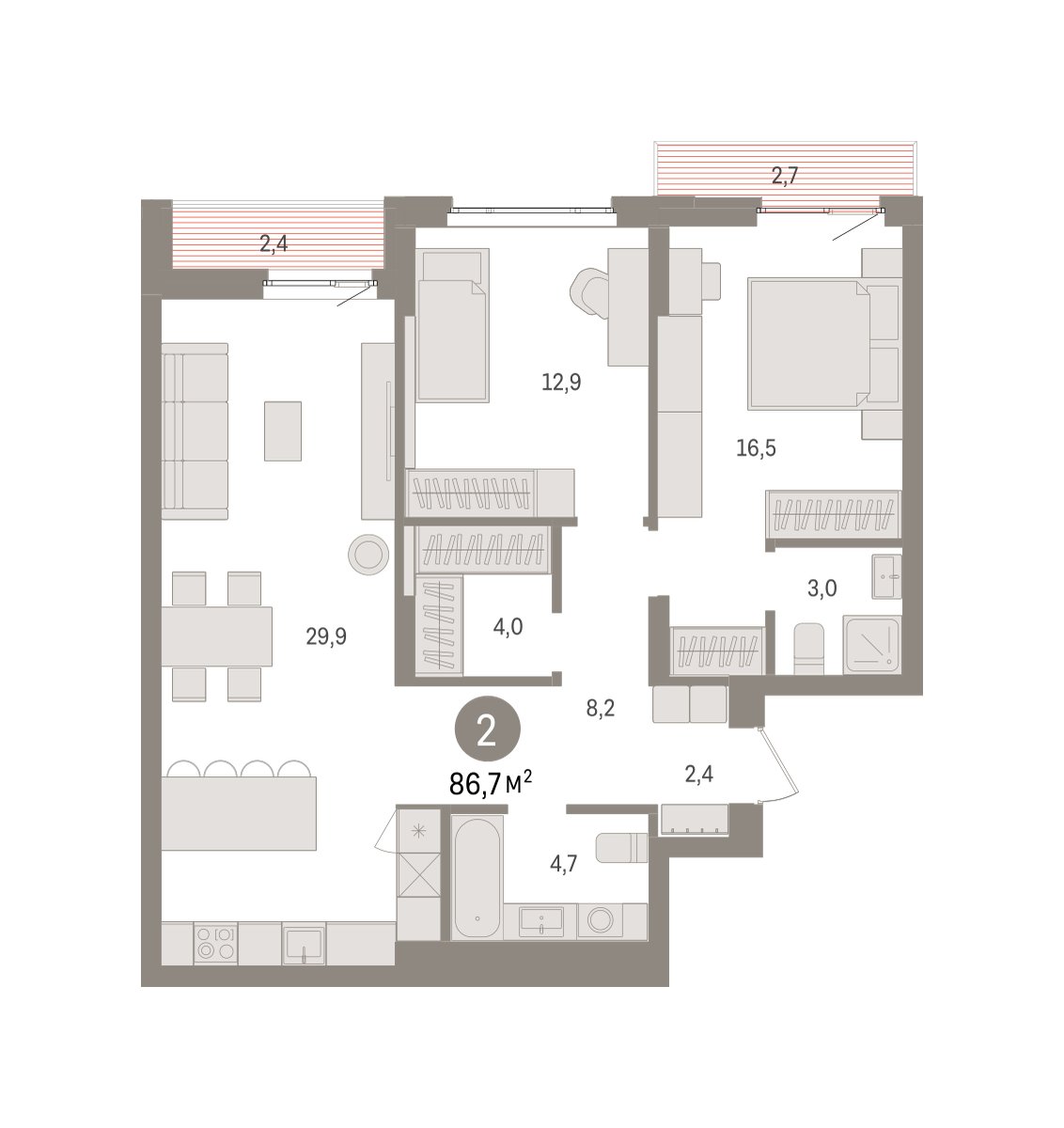 Квартира с кухней-гостиной и двумя спальнями в квартале «Траектория». Особенности планировки: балкон, предчистовая отделка, разнесённые спальни. № квартиры в нашей базе: МНВ01-Ж12.6.1.