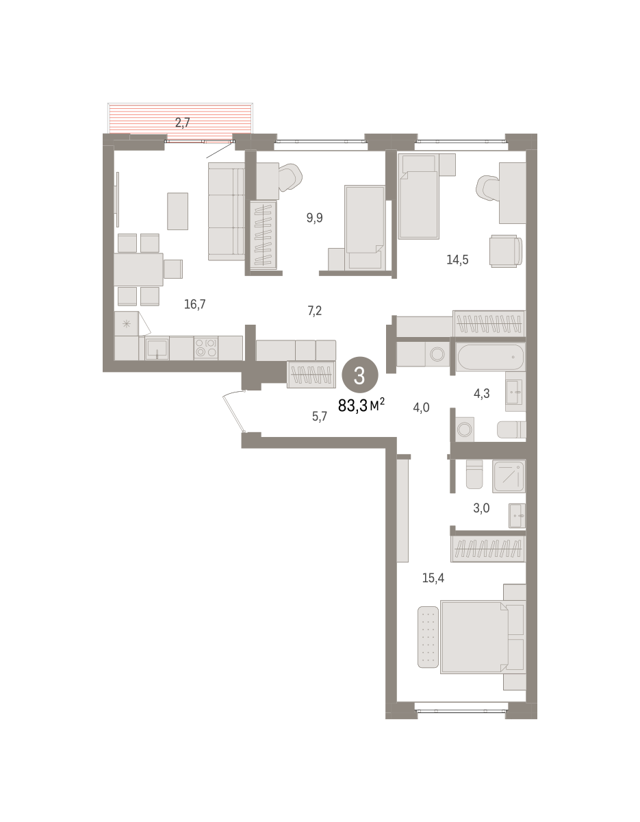 Квартира с кухней-гостиной и тремя спальнями в квартале «Траектория». Особенности планировки: балкон, окна на две стороны, предчистовая отделка, разнесённые спальни. № квартиры в нашей базе: МНВ01-Ж14.4.1.