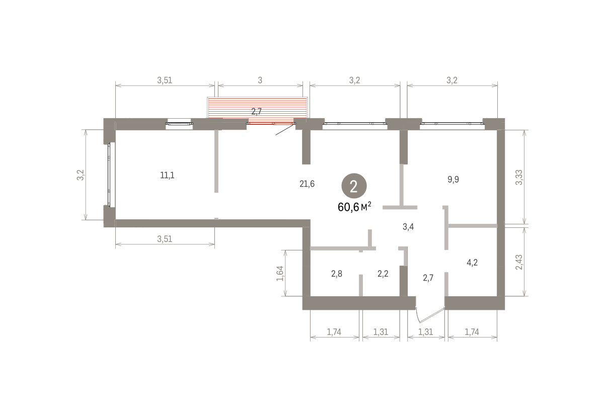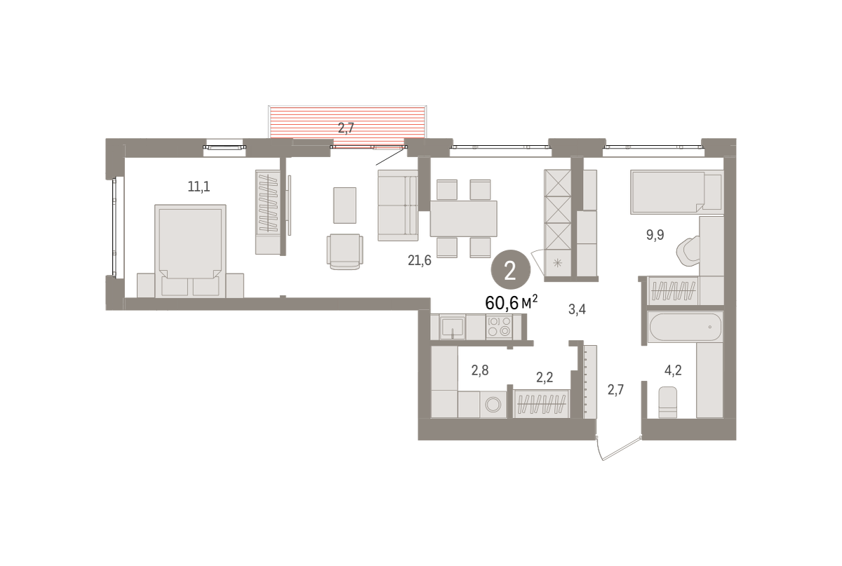 Продаётся с кладовой. Квартира с кухней-гостиной и двумя спальнями в квартале «Траектория». Особенности планировки: балкон, предчистовая отделка, разнесённые спальни. № квартиры в нашей базе: МНВ01-Ж10.4.7.