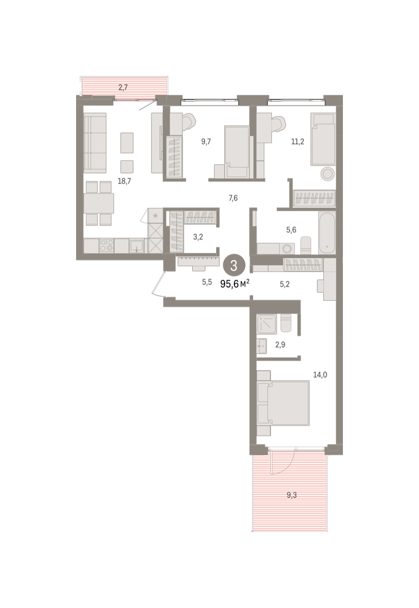 Квартира с кухней-гостиной и тремя спальнями в квартале «Траектория». Особенности планировки: балкон, предчистовая отделка, разнесённые спальни. № квартиры в нашей базе: МНВ01-Ж7.2.6.