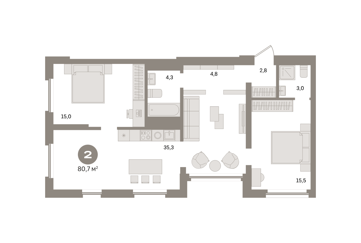 Квартира с кухней-гостиной и двумя спальнями в Южных кварталах. Особенности планировки: разнесённые спальни, предчистовая отделка, мастер-спальня.