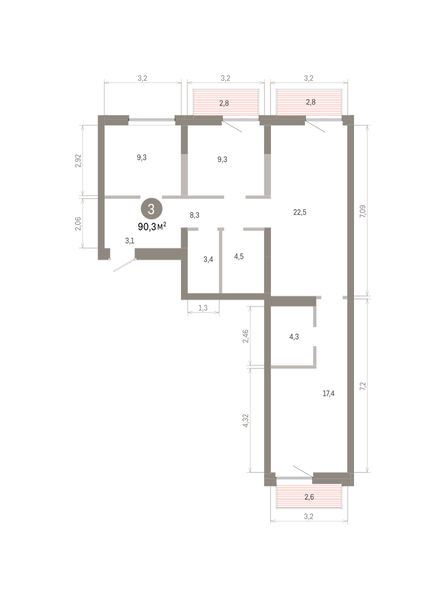 Квартира с кухней-гостиной и тремя спальнями в Южных кварталах. Особенности планировки: балкон, вид во двор, мастер-спальня, окна на две стороны, постирочная, предчистовая отделка, разнесённые спальни.