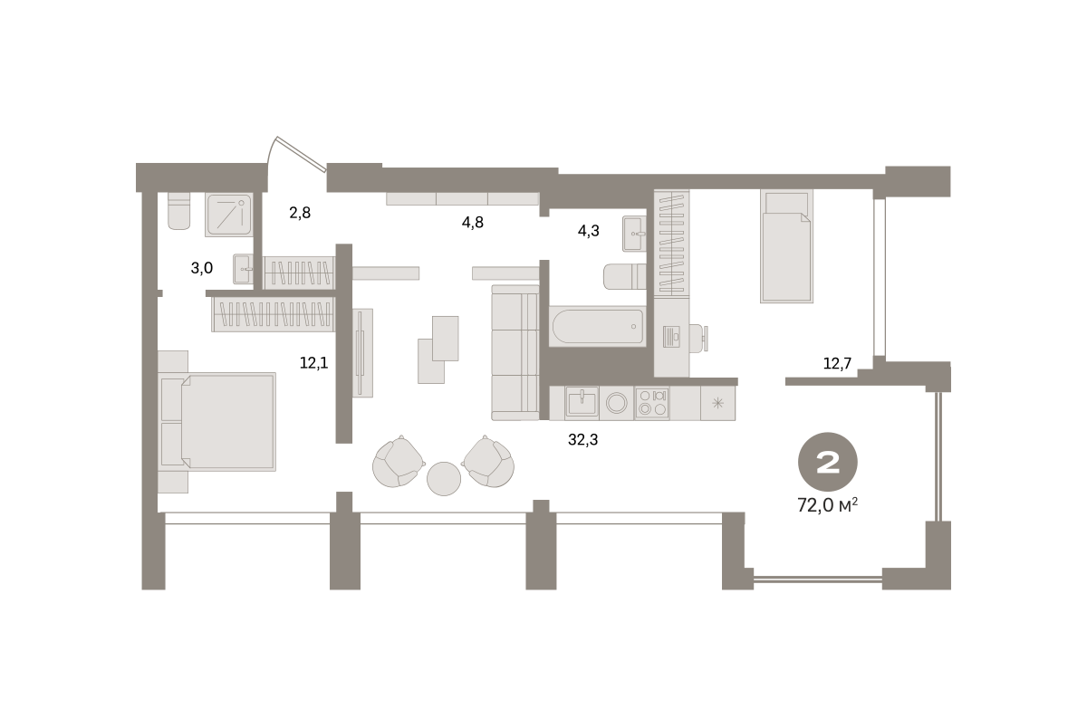 Двухкомнатная квартира в «Южном квартале» — это квартира с большой кухней, которая объединена с гостиной, и двумя спальнями. Кухня-гостиная — это общественное пространство квартиры, где удобно собираться с семьей и друзьями. Здесь легко поместится зона приготовления пищи, стол со стульями для совместных трапез, мягкие места для отдыха и телевизор. Купить двухкомнатную квартиру в юго-западном районе Екатеринбурга рядом с автовокзалом выгодно напрямую от застройщика «Брусника».