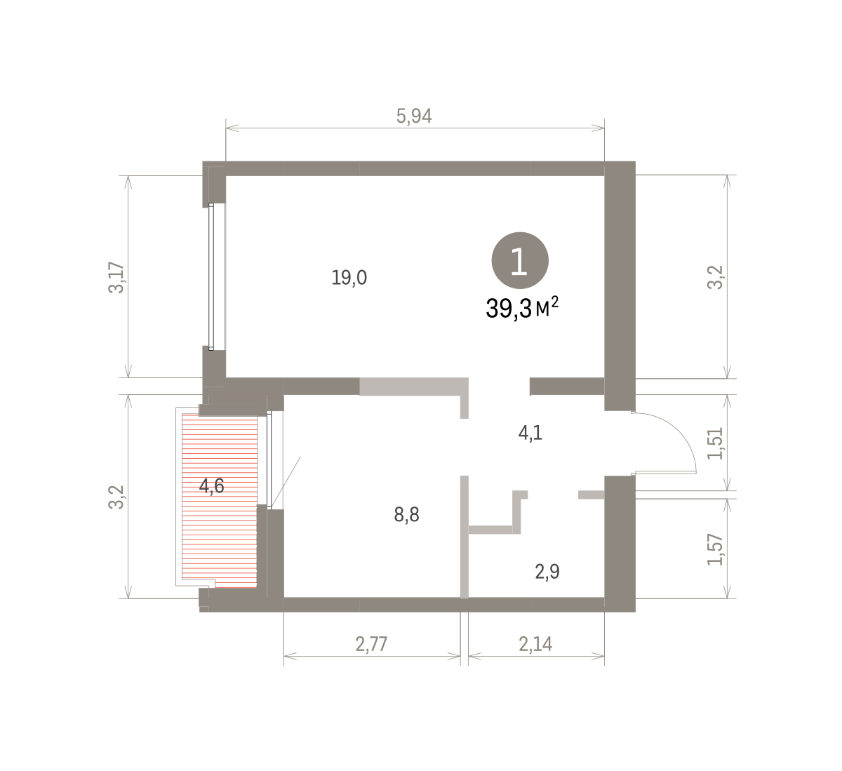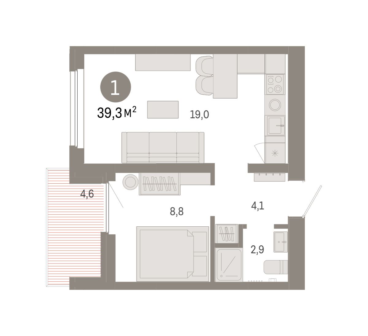 Квартира с кухней-гостиной и одной спальней в Бруснике в Академическом. Особенности планировки: балкон, предчистовая отделка. № квартиры в нашей базе: АКД04-Ж5.9.3.