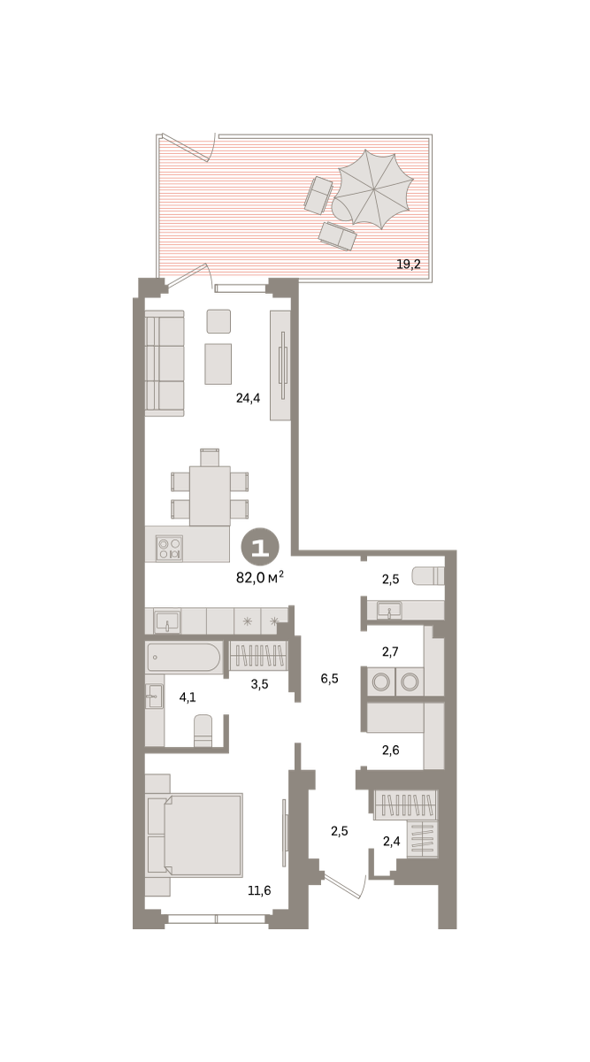 Квартира с кухней-гостиной и одной спальней в квартале «Депо». Особенности планировки: вид во двор, второй санузел, гардеробная, мастер-спальня, окна в пол, окна на две стороны, отдельный вход, панорамное остекление, постирочная, предчистовая отделка, терраса.
