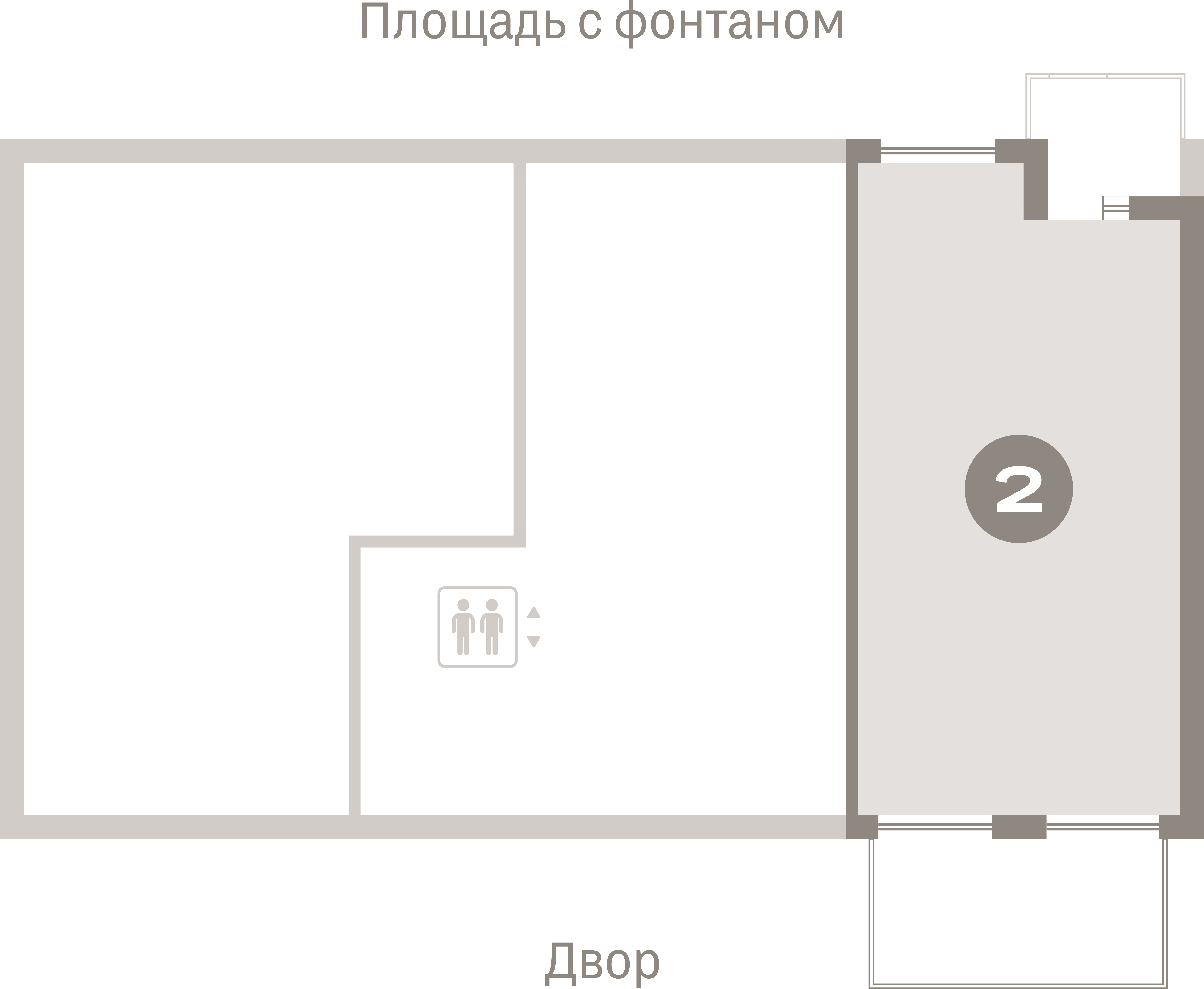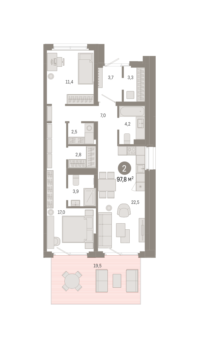 Квартира с кухней-гостиной и двумя спальнями в Бруснике в Академическом. Особенности планировки: вид во двор, второй санузел, гардеробная, мастер-спальня, окна в пол, отдельный вход, панорамное остекление, постирочная, предчистовая отделка, разнесённые спальни, терраса.