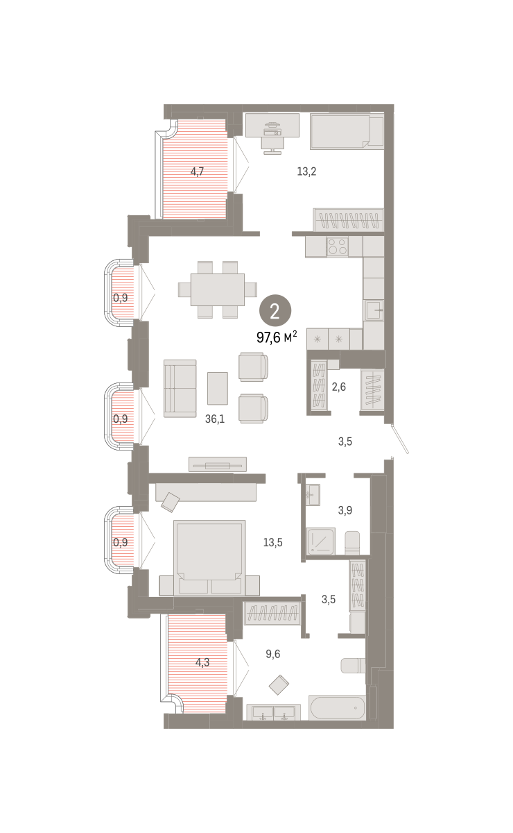 Квартира с кухней-гостиной и двумя спальнями в квартале «На Некрасова». Особенности планировки: второй санузел, мастер-спальня, окно в санузле, предчистовая отделка. № квартиры в нашей базе: НКР02-Ж2.7.2.